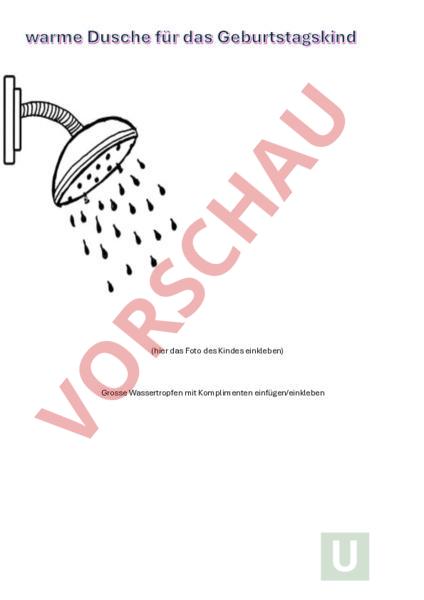 Ein Dokument mit einem Duschkopf, auf das man ein Foto des Geburtstagskindes hineinleben und Komplimente reinschreiben kann.