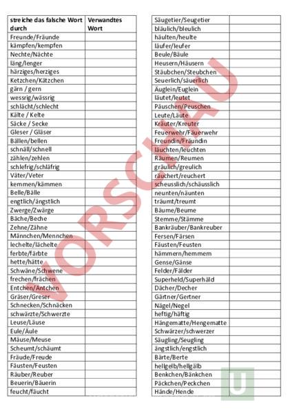streiche das falsche Wort Verwandtes durch Wort Freunde/Fräunde kämpfen/kempfen Nechte/Nächte läng/lenger härziges/herziges Ketzchen/Kätzchen gärn gern wessrig/wässrig schlächt/schlecht Kälte Kelte Säcke Secke Gleser Gläser Bällen/bellen schnäll/schnell zählen/zehlen schlefrig/schläfrig Väter/Veter kemmen/kämmen Belle/Bälle engtlich/ängstlich Zwerge/Zwärge Bäche/Beche Zehne/Zähne Männchen/Mennchen lechelte/lächelte ferbte/färbte hette/hätte Schwäne/Schwene frechen/frächen Entchen/Äntchen Gräser/Greser Schnecken/Schnäcken schwärzte/Schwerzte Leuse/Läuse Eule/Äule Mäuse/Meuse Scheumt/schäumt Fräude/Freude Fäusten/Feusten Räuber/Reuber Beuerin/Bäuerin feucht/fäucht Säugetier/Seugetier bläulich/bleulich häulten/heulte läufer/leufer Beule/Bäule Heusern/Häusern Stäubchen/Steubchen Seuerlich/säuerlich Äuglein/Euglein läutet/leutet Päuschen/Peuschen Leute/Läute Kräuter/Kreuter Feuerwehr/Fäuerwehr Freundin/Fräundin läuchten/leuchten Räumen/Reumen gräulich/greulich räuchert/reuchert scheusslich/schäusslich neunten/näunten träumt/treumt Bäume/Beume Stemme/Stämme Bankräuber/Bankreuber Fersen/Färsen Fäusten/Feusten hämmern/hemmern Gense/Gänse Felder/Fälder Superheld/Superhäld Dächer/Decher Gärtner/Gertner Nägel/Negel heftig/häftig Hängematte/Hengematte Schwärzer/schwerzer Säugling/Seugling ängstlich/engstlich Bärte/Berte hellgelb/hellgälb Benkchen/Bänkchen Päckchen/Peckchen Hände/Hende Feuchtigkeit/Fäuchtigkeit zählt/zehlt Geld/Gäld Wädlern/Weldern Äste/Este kälter/kelter streuen/sträuen Zwerge/Zwärge Erbsen/Ärbsen Stern/Stärn Wörter ab 4 Klasse Geste/Gäste wertvolle/wärtvolle Schätze/Schatze heulen/häulen bellen/bällen gesättigten/gesettigten Vorräten/Vorreten Kestchen/Kästchen Ernehrung/Ernährung Fett/Fätt auffällig/auffellig wächst/wechst prechtig/prächtig Fälschung/Felschung Sefte/Säfte Hälse/Helse bläulich/bleulich Fäulnis/Feulins glenzen/glänzen Deumchen/Däumchen erkleren/erklären Brände/Brende zärtlich/zertlich Armbender/Armbänder Beute/Bäute Beckerei/Bäckerei rechten/rächten scheue/schäue Beutel/Bäutel Gefährlich/Gefehrlich Unfelle/Unfälle Lender/Länder