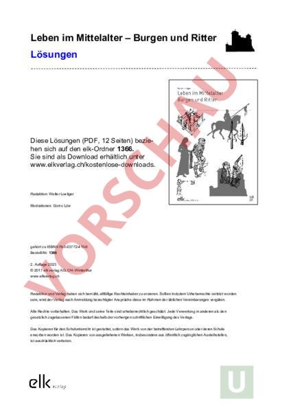 Leben im Mittelalter – Burgen und Ritter Lösungen Diese Lösungen (PDF, 12 Seiten) beziehen sich auf den elk-Ordner 1366. Sie sind als Download erhältlich unter www.elkverlag.ch/kostenlose-downloads. Redaktion: Walter Loeliger lllustrationen: Domo Löw gehört zu ISBN 978-3-03772-415-6 Bestell-Nr. 1366 2. Auflage 2023 2017 elk verlag AG, CH–Winterthur www.elkverlag.ch Redaktion und Verlag haben sich bemüht, allfällige Rechteinhaber zu eruieren. Sollten trotzdem Urheberrechte verletzt worden sein, wird der Verlag nach Anmeldung berechtigter Ansprüche diese im Rahmen der üblichen Vereinbarungen vergüten. Alle Rechte vorbehalten. Das Werk und seine Teile sind urheberrechtlich geschützt. Jede Verwertung in anderen als den gesetzlich zugelassenen Fällen bedarf deshalb der vorherigen schriftlichen Einwilligung des Verlags. Das Kopieren für den Schulunterricht ist gestattet, sofern das Werk von der betreffenden Lehrperson oder deren Schule erworben worden ist. Das Kopieren von ausgeliehenen Werken, insbesondere aus öffentlich zugänglichen Ausleihstellen, ist ausdrücklich verboten. Lösungen zu 1 Zeitalter: Wo sind wir? 1. Lies im Magazin den Text auf Seite 1 sorgfältig durch. Leg anschliessend das Magazin zur Seite. Beantworte die folgende Frage, ohne im Magazin nachzusehen. Was sind die wesentlichen Veränderungen, die im Laufe des Mittelalters geschehen sind? Zähle auf. Grosse Waldflächen wurden gerodet. So entstand neues Ackerland. Die Bevölkerung wuchs fortwährend. Die Städte wurden grösser. Reiche Ritter liessen sich imposante Burgen bauen. 2. Im Zahlenstrahl sind die Jahrhunderte angeschrieben. a) Wir befinden uns heute im ersten Teil des 21. Jahrhunderts. Trage ungefähr beim aktuellen Jahr einen roten Punkt ein. b) Überlege: Wo war Christi Geburt? c) Bezeichne die Jahre 500, 1000, 1250 und 1500 mit einem kleinen Bleistiftkreuz. d) Im Magazin auf Seite 1 findest du Angaben zur Unterteilung des Mittelalters in drei Zeiträume. Male im Zahlenstrahl die drei Zeiträume mit unterschiedlichen Farben aus. Benenne die drei farbigen Bereiche mit den Buchstaben F, und S. e) Diskutiere deine Einträge mit einem Partner oder einer Partnerin. f) Schreibe die drei korrekten Bezeichnungen auf die Linien. 3. 2. 1. 1. 2. 3. 4. 5. 6. Jahr 0 (Christi Geburt) F: Frühmittelalter H: Hochmittelalter S: Spätmittelalter zu Seite 15 7. 8. 9. 10. 11. 12. 13. 14. 15. 16. 17. 18. 19. 20. 21. 22. elk verlag Leben im Mittelalter – Burgen und Ritter – Lösungen Lösungen zu 6 Beleuchtung (A) 1. Lies im Magazin auf Seite 17 den Text über die Beleuchtung. 2. Suche die drei Leuchtobjekte auch im digitalen Schulwandbild. Du findest sie im Festsaal oder im Schlafgemach. 3. Schreibe die drei Bilder hier korrekt an. Kerzen(-leuchter) Fackel 4. Alle drei Beleuchtungsarten haben Vor- und Nachteile. Zeichne auf der Rückseite des Blattes eine Tabelle. Sie soll ungefähr so aussehen, aber grösser. Vorteile Kienspan Nachteile Kerze Wachskerzen werden bei besonderen Anlässen aufgestellt. Bienenwachskerzen sind teuer. Kienspan Der Kienspan ist einfach zu beschaffen, ist günstig und brennt lang. Der Kienspan gibt nur wenig Licht. Die Fackel ergibt helles Licht. Die Fackel erzeugt Russ und Rauch. Fackel 5. Fülle die Tabelle aus. zu Seite 20 elk verlag Leben im Mittelalter – Burgen und Ritter – Lösungen Lösungen zu 7 Beleuchtung (B) 1. Lies den Text im Magazin auf Seite 17 über die Beleuchtung. Du findest auch Bilder dazu im digitalen Schulwandbild. 2. Neben den drei Leuchtmitteln Kerze, Kienspan und Fackel gab es noch weitere Möglichkeiten, etwas Licht ins Zimmer zu bringen. Zum Beispiel Öllämpchen das Es konnte sehr verschieden aussehen. 3. Recherchiere, wie diese kleine Beleuchtung funktioniert. Schreibe hier deine Überlegungen auf. In einem flachen Gefäss aus Metall liegt etwas Öl. Ein Docht aus Baumwolle liegt im Öl. Er wird von einer Vorrichtung so gehalten, dass das eine Ende stets gegen oben aus dem Öl herausschaut. Das Öl am oberen Ende des Dochts brennt. Der Docht saugt fortwährend neues Öl nach. 4. Im digitalen Schulwandbild gibt es einen kurzen Film über die Wohngemächer. Darin wird auch von diesem kleinen Lämpchen gesprochen. Sieh dir den Film „Die Wohngemächer an. 5. Es gibt einen kleinen Widerspruch zwischen dem gesprochenen Text und den Filmaufnahmen. Schreibe hier den Timecode auf, bei dem dir der Widerspruch auffällt. Beschreibe den Widerspruch. Timecode etwa zwischen 00:30 und 00:40. Der Sprecher sagt: „Licht gab es nur von der Fackel oder aus Öllämpchen. Im Film sieht man aber einen Kienspan. zu Seite 21 elk verlag Leben im Mittelalter – Burgen und Ritter – Lösungen Lösungen zu 10 Essen und trinken (A) 1. Lest den Text im Magazin auf den Seiten 12 und 13. 2. Diskutiert die folgenden Fragen: Wann habt ihr zum letzten Mal Teigwaren gegessen? Wann habt ihr zum letzten Mal Kartoffeln gegessen? Wie oft pro Woche esst ihr Fleisch (durchschnittlich)? 3. Zählt alle Bestandteile auf, die zum Gedeck eines mittelalterlichen Festessens gehören. Dazu müsst ihr den ganzen Text auf Einzelheiten absuchen. Als Unterlage diente ein alter Brotfladen Das Besteck bestand aus Löffel und Messer. Es gab keine Gabeln. Die Trinkkelche waren aus Zinn oder Silber. Die Becher waren aus Holz oder Ton. 4. Zeichnet ein heutiges Tischgedeck für ein Dreigang-Menu. Beachtet: Was liegt links, was liegt rechts vom Teller, was oben? Tragt Nummern ein und schreibt die Begriffe rechts auf. zu Seite 24 elk verlag Leben im Mittelalter – Burgen und Ritter – Lösungen Lösungen zu 11 Essen und trinken (B) 1. Lies die Seiten 12 und 13 im Magazin. 2. Jetzt kannst du die ersten drei Fragen beantworten. Versuche es zunächst aus dem Gedächtnis. In einem zweiten Schritt nimmst du das Magazin zu Hilfe. Für die vierte Frage brauchst du Sachbücher oder das Internet. Zähle die Speisen auf, die die einfachen Leute zur Hauptsache assen. Gemüsesuppe, Hirsebrei, Brotfladen Edelleute beka