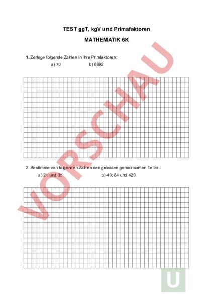Arbeitsblatt: 6K TEST ggT, kgV und Primafaktoren