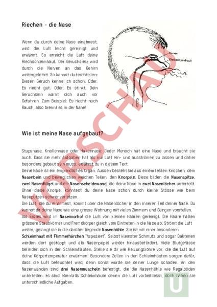 Riechen die Nase Wenn du durch deine Nase einatmest, wird die Luft leicht gereinigt und erwärmt. So erreicht die Luft deine Riechschleimhaut. Der Geruchsreiz wird durch die Nerven an das Gehirn weitergeleitet. So kannst du feststellen: Diesen Geruch kenne ich schon. Oder: Es riecht gut. Oder: Es stinkt. Dein Geruchsinn warnt dich auch vor Gefahren. Zum Beispiel: Es riecht nach Rauch, also brennt es in der Nähe! Wie ist meine Nase aufgebaut? Stupsnase, Knollennase oder Hakennase. Jeder Mensch hat eine Nase und braucht sie auch. Dass sie mehr Aufgaben hat als nur Luft ein- und ausströmen zu lassen und daher besonders gebaut sein muss, erfährst du in diesem Text. Deine Nase ist ein empfindliches Organ. Aussen besteht sie aus einem festen Knochen, dem Nasenbein und beweglichen weichen Teilen, den Knorpeln. Diese bilden die Nasenspitze, zwei Nasenflügel und die Nasenscheidewand, die deine Nase in zwei Nasenlöcher unterteilt. Ohne diese Knorpel könntest du deine Nase schon durch kleine Stösse wie beim Naseputzen schwer verletzen. Die Luft, die du einatmest, kommt über die Nasenlöcher in den inneren Teil deiner Nase. Du kannst dir deine Nase wie eine grosse Wohnung mit vielen Zimmern und Gängen vorstellen. Als Erstes wird im Nasenvorhof die Luft von kleinen Haaren gereinigt. Die Haare halten grössere Staubkörner und Fremdkörper gleich vom Eintreten in die Nase ab. Strömt die Luft weiter, gelangt sie in die darüber liegende Nasenhöhle. Sie ist mit einer besonderen Schleimhaut mit Flimmerhärchen tapeziert. Selbst kleinster Schmutz und sogar Bakterien werden dort gestoppt und als Nasenpopel wieder hinausbefördert. Viele Blutgefässe befinden sich in den Schleimhäuten. Stelle sie dir wie Heizungsrohre vor, die die Luft auf deine Körpertemperatur erwärmen. Besondere Zellen in den Schleimhäuten sorgen dafür, dass die Luft befeuchtet wird, denn sonst würde sie deiner Lunge schaden. An den Nasenwänden sind drei Nasenmuscheln befestigt, die die Nasenhöhle wie Regalböden unterteilen. Es sind ebenfalls Schleimhäute denen die Luft vorbeifliesst, doch haben sie unterschiedliche Aufgaben. Auf der obersten Nasenmuschel befindet sich die Riechschleimhaut, die mit feinsten Härchen besetzt ist. Man nennt sie auch Riechzellen. Sie fangen ankommende Gerüche auf und geben sie über den Riechkolben an den Riechnerv weiter. Hier wird der Geruch in Signale umgewandelt, die dein Gehirn aufnimmt. Jetzt kannst du etwas riechen. Die mittlere Nasenmuschel leitet die Luft an alle Nasennebenhöhlen. Die Hohlräume machen deinen Kopf etwas leichter und zudem würde sich deine Stimme ohne diese ganz anders anhören. Wie bei einer Gitarre wirken die Hohlräume als Verstärker. Strömt die Luft an der unteren Nasenmuschel vorbei, so gelangt sie in den Rachenraum und belüftet über weitere Leitungen dein Mittelohr. Bei Schnupfen werden die Nasenmuscheln immer dicker und schwellen an. So kommt kaum noch Luft an deinen Riechnerv, in die Nebenhöhlen und in den Rachen. Sicher hattest du selbst schon eine Erkältung und konntest kaum etwas riechen, deine Stimme hörte sich seltsam an und das Essen schmeckte auch nicht wirklich. Was die Nase alles kann, merkt man also erst, wenn sie nicht mehr ganz funktioniert. Wusstest du? Die Reinigung der Atemluft ist im Staub der Städte und der Industriegebiete sehr wichtig. Luft über einem Waldgebiet enthält pro Liter 40 500 Staubteilchen, über einem Industriegebiet dagegen mehr als 85 00. Auch an belebten Plätzen und Strassen von Städten wurden ähnliche Staubmengen festgestellt. Ohne die Reinigung der Luft in den Atemwegen käme davon rund die Hälfte in die Lungen! Reinigung der Luft Am Eingang der Nase befinden sich . welche die Luft grob filtern. Feine Staubteilchen und Bakterien werden von den feuchten . aufgehalten. Wie wird dieser abgefilterte Staub wieder entfernt? . . . Durch die Flimmerhärchen im Atemkanal . werden letzte von der Nase bis zur . aufgehalten und wieder in den Rachen befördert. Vorwärmung der Luft Die drei übereinander liegenden Muscheln in den Nasenhöhlen sind sehr gut . An ihnen . sich die Luft. Prüfung der Luft Die Prüfung der Luft ist die Aufgabe der . oder allgemein des Geruchssinnes. Befeuchtung der Luft Die . geben ständig Wasser ab und befeuchten die eingeatmete Luft. So ist meine Nase aufgebaut Du hast den Text genau gelesen, dann kennst du dich sicher gut aus. Fülle das Kreuzworträtsel mithilfe des Bildes aus. Du hast alle Teile benennen können? Dann bist du schon eine sehr gute .