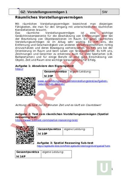 GZ: Vorstellungsvermögen 1 SW Räumliches Vorstellungsvermögen Mit räumlichen Vorstellungsvermögen bezeichnet man diejenigen Fähigkeiten, die man für den Umgang mit unterschiedlichen räumlichen Konstellationen braucht. Das räumliche Vorstellungsvermögen ist eine wichtige Gedächtniskomponente für die Abschätzung von Entfernungen oder bei der Beurteilung von Objektpositionen im Raum. Ein gutes räumliches Vorstellungsvermögen ist im Alltag sehr wichtig. Es hilft uns, die Entfernung und Geschwindigkeit von anderen Verkehrsteilnehmern richtig einzuschätzen und deren Bewegung vorherzusehen. Es hilft uns bei der Orientierung im Raum und beim Lesen von Strassenkarten. Es hilft uns, Zeichnungen und Gesichter zu erkennen. Auch für viele Sportarten (z.B. Ballsportarten) und für einige Berufe ist eine gute Einschätzung von Objekt, Zeit und Raum eine wichtige Voraussetzung für Erfolg. Aufgabe 1: Absolviere den Eignungstest http:// Gesamtpunktza eigene Leistung: hl 20P www.ausbildungspark.com/einstellungstest/aufgabenraeumliches-denken/ Achtung: du hast nur 20 Minuten Zeit und es läuft ein Countdown! Aufgabe 2: Test zum räumlichen Vorstellungsvermögen (Spatial reasoning test) Gesamtpunktza eigene Leistung: hl 10P Aufgabe 3: Spatial Reasoning Sub-test Gesamtpunktza eigene Leistung: hl 14P 1 GZ: Vorstellungsvermögen 1 SW 2 GZ: Vorstellungsvermögen 1 SW 3 GZ: Vorstellungsvermögen 1 SW 4 GZ: Vorstellungsvermögen 1 SW Welche Körperpaare passen zusammen? Mal die Quadrate mit der gleichen Farbe aus: 5 GZ: Vorstellungsvermögen 1 SW 6