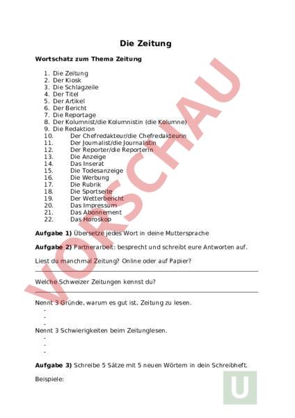 Die Zeitung Wortschatz zum Thema Zeitung 1. Die Zeitung 2. Der Kiosk 3. Die Schlagzeile 4. Der Titel 5. Der Artikel 6. Der Bericht 7. Die Reportage 8. Der Kolumnist/die Kolumnistin (die Kolumne) 9. Die Redaktion 10. Der Chefredakteur/die Chefredakteurin 11. Der Journalist/die Journalistin 12. Der Reporter/die Reporterin 13. Die Anzeige 14. Das Inserat 15. Die Todesanzeige 16. Die Werbung 17. Die Rubrik 18. Die Sportseite 19. Der Wetterbericht 20. Das Impressum 21. Das Abonnement 22. Das Horoskop Aufgabe 1) Übersetze jedes Wort in deine Muttersprache Aufgabe 2) Partnerarbeit: besprecht und schreibt eure Antworten auf. Liest du manchmal Zeitung? Online oder auf Papier? Welche Schweizer Zeitungen kennst du? Nennt 3 Gründe, warum es gut ist, Zeitung zu lesen. Nennt 3 Schwierigkeiten beim Zeitunglesen. Aufgabe 3) Schreibe 5 Sätze mit 5 neuen Wörtern in dein Schreibheft. Beispiele: 1. Zeitung – Jeden Morgen lese ich die Zeitung mit meinem Kaffee. 2. Zeitungskiosk – Am Eckshop steht der Zeitungskiosk, wo ich eine Zeitung kaufe. 3. Zeitung lesen – Er möchte jeden Abend die Zeitung lesen. 4. Schlagzeilen – Die Schlagzeilen heute sind sehr spannend. 5. Titel – Der Titel des Artikels klingt interessant. 6. Artikel – Im Artikel geht es um Umweltprobleme. 7. Bericht – Der Bericht erklärt, was gestern passiert ist. 8. Reportagen – Die Reportagen berichten über das Leben in der Stadt. 9. Kolumnist – Die Kolumnistin schreibt witzige Kolumnen. 10. Redaktion – In der Redaktion arbeiten viele Redakteure. 11. Chefredakteur – Der Chefredakteur entscheidet, welche Artikel erscheinen. 12. Journalist – Der Journalist interviewt den Politiker. 13. Reporter – Der Reporter berichtet live aus dem Stadion. 14. Fotografien – Die Fotografien im Zeitungsartikel sind sehr aussagekräftig. 15. Anzeigen – Die Anzeigen zeigen neue Angebote der Geschäfte. 16. Rubrik – In der Rubrik Sport gibt es heute viele Ergebnisse. 17. Sportseiten – Die Sportseiten berichten von Fußballspielen. 18. Wetterbericht – Der Wetterbericht sagt Sonnenschein für morgen voraus. 19. Impressum – Im Impressum stehen Informationen zur Herausgeberin. 20. Abonnement – Er hat ein Abonnement für die Wochenzeitung.