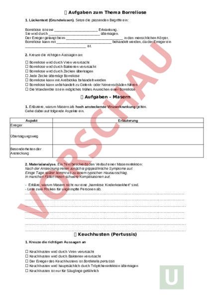 Arbeitsblatt: Aufgaben zum Thema Borreliose, Windpocken (Varizellen), Keuchhusten (Pertussis)