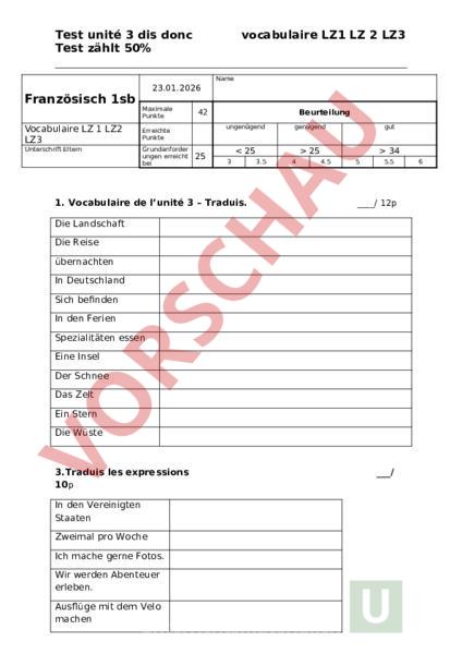 Test unité 3 dis donc Test zählt 50% vocabulaire LZ1 LZ 2 LZ3 Name Französisch 1sb Vocabulaire LZ 1 LZ2 LZ3 Unterschrift Eltern 23.01.2026 Maximale Punkte 42 ungenügend Erreichte Punkte Grundanforder ungen erreicht bei Beurteilung 25 genügend 25 3 1. Vocabulaire de lunité 3 – Traduis. gut 25 3.5 4 34 4.5 5 5.5 / 12p Die Landschaft Die Reise übernachten In Deutschland Sich befinden In den Ferien Spezialitäten essen Eine Insel Der Schnee Das Zelt Ein Stern Die Wüste 3.Traduis les expressions 10p In den Vereinigten Staaten Zweimal pro Woche Ich mache gerne Fotos. Wir werden Abenteuer erleben. Ausflüge mit dem Velo machen/ 6 Test unité 3 dis donc Test zählt 50% vocabulaire LZ1 LZ 2 LZ3 Tiere beobachten Wir gehen am Abend gerne aus. Wir werden die Stadt entdecken. Ich werde ein Buch lesen. Was wirst du machen? 3. Traduis en allemand La forêt Nous allons dormir à lhôtel visiter Paris Où vas- tu bronzer Le pays Le paysage avoir besoin de coûter apprendre une langque / 10p Test unité 3 dis donc Test zählt 50% 4. Corrige les fautes En Portugal Au Etats-unis En Genève Il fait moins 10 degré Jaime prendre de photos Nous allez dormir à lhôtel Le magazin La fôret observer des animaus manger des spécialites vocabulaire LZ1 LZ 2 LZ3 / 10p Test unité 3 dis donc Test zählt 50% vocabulaire LZ1 LZ 2 LZ3 1. Vocabulaire de lunité 3 – Traduis. Die Landschaft Le paysage Die Reise Le voyage übernachten loger In Deutschland En Allemagne Sich befinden se trouver In den Ferien pendant les vacances Spezialitäten essen manger des spécialités Eine Insel Une île Der Schnee La neige Das Zelt La tente Ein Stern Une étoile Die Wüste Le désert 3.Traduis les expressions 10p In den Vereinigten Staaten Aux Etats- unis Zweimal pro Woche Deux fois par semaine Ich mache gerne Fotos. Jaime prendre des photos Wir werden Abenteuer erleben. Nous allons vivre des aventures Ausflüge mit dem Velo machen faire des excursion à vélo Tiere beobachten observer des animaux Wir gehen am Abend gerne aus. Nous aimons sortir le soir Wir werden die Stadt entdecken. Nous allons découvrir la ville Ich werde ein Buch lesen. Je vais lire un livre Was wirst du machen? Quest-ce que tu vas faire / 12p/ Test unité 3 dis donc Test zählt 50% vocabulaire LZ1 LZ 2 LZ3 3. Traduis en allemand / 10p La forêt Der Walt Nous allons dormir à lhôtel Wir werden im Hotel schlafen. visiter Paris Paris besuchen Où vas- tu Wohin gehst du bronzer Sich bräunen, sonnenbaden Le pays Das Land Le paysage Die Landschaft avoir besoin de brauchen coûter kosten apprendre une langque Eine Sprache lernen 4. Corrige les fautes / 10p En Portugal Au Portugal Au Etats-unis Aux Etats- unis En Genève Genève Il fait moins 10 degré Il fait moins 10 degrés Test unité 3 dis donc Test zählt 50% vocabulaire LZ1 LZ 2 LZ3 Jaime prendre de photos Jaime prendre des photos Nous allez dormir à lhôtel Nous allons dormir à lhôtel Le magazin Le magasin La fôret La forêt observer des animaus Observer des animaux manger des spécialites Manger des spécialités