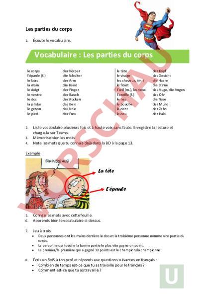 Les parties du corps 1. Écoute le vocabulaire. Vocabulaire Les parties du corps le corps lépaule (f.) le bras la main le doigt le ventre le dos la jambe le genou le pied 2. 3. 4. der Körper die Schulter der Arm die Hand der Finger der Bauch der Rücken das Bein das Knie der Fuss la tête le visage les cheveux, (m.) le front lœil (m.), les yeux loreille (f.) le nez la bouche la dent le cou der Kopf das Gesicht die Haare die Stirne das Auge, die Augen das Ohr die Nase der Mund der Zahn der Hals Lis le vocabulaire plusieurs fois et à haute voix sans faute. Enregistre ta lecture et charge-la sur Teams. Mémorise bien les mots. Note les mots que tu connais déjà dans la BD à la page 13. Exemple La tête Lépaule 5. 6. 7. Corrige les mots avec cette feuille. Apprends bien le vocabulaire ci-dessus. Jeu à trois • • • 8. Deux personnes ont les mains derrière le dos et la troisième personne nomme une partie du corps. La personne qui touche la bonne partie le plus vite gagne un point. Le premier/la première qui gagné 10 points est le champion/la championne. Écris un SMS à ton prof et réponds aux questions suivantes en français • Combien de temps est-ce que tu as travaillé pour le français • Comment est-ce que tu as travaillé