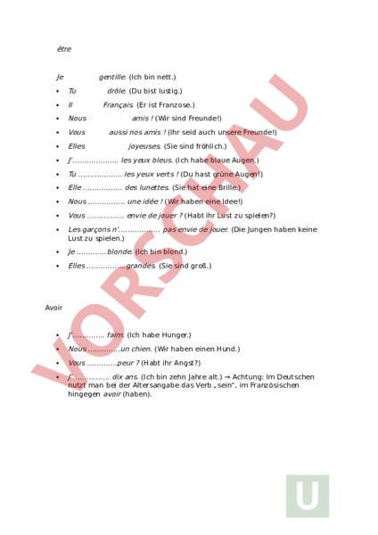 être Je gentille. (Ich bin nett.) Tu drôle. (Du bist lustig.) Il Nous Vous Elles J les yeux bleus. (Ich habe blaue Augen.) Tu . les yeux verts (Du hast grüne Augen!) Elle des lunettes. (Sie hat eine Brille.) Nous . une idée (Wir haben eine Idee!) Vous . envie de jouer (Habt ihr Lust zu spielen?) Les garçons n pas envie de jouer. (Die Jungen haben keine Lust zu spielen.) Je .blonde. (Ich bin blond.) Elles grandes. (Sie sind groß.) Français. (Er ist Franzose.) amis (Wir sind Freunde!) aussi nos amis (Ihr seid auch unsere Freunde!) joyeuses. (Sie sind fröhlich.) Avoir J faim. (Ich habe Hunger.) Nous un chien. (Wir haben einen Hund.) Vous .peur (Habt ihr Angst?) J. dix ans. (Ich bin zehn Jahre alt.) Achtung: Im Deutschen nutzt man bei der Altersangabe das Verb „sein, im Französischen hingegen avoir (haben).