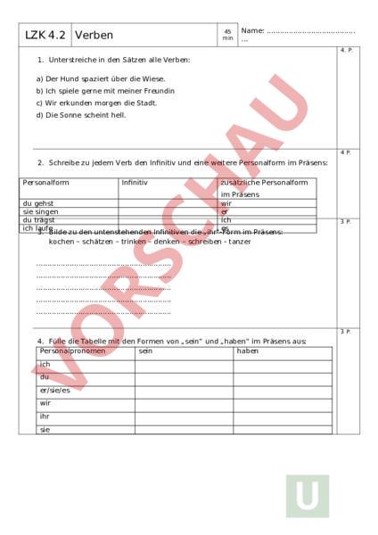 45 min LZK 4.2 Verben Name: . 4. P. 1. Unterstreiche in den Sätzen alle Verben: a) Der Hund spaziert über die Wiese. b) Ich spiele gerne mit meiner Freundin c) Wir erkunden morgen die Stadt. d) Die Sonne scheint hell. 4 P. 2. Schreibe zu jedem Verb den Infinitiv und eine weitere Personalform im Präsens: Personalform Infinitiv zusätzliche Personalform im Präsens du gehst wir sie singen er du trägst ich ich laufe es 3. Bilde zu den untenstehenden Infinitiven die „ihr-Form im Präsens: kochen – schätzen – trinken – denken – schreiben tanzen 3 P. . . . . . 3 P. 4. Fülle die Tabelle mit den Formen von „sein und „haben im Präsens aus: Personalpronomen sein haben ich du er/sie/es wir ihr sie 5 P. 5. Markiere die trennbaren Verben und schreibe sie hinten im Infinitiv auf die Linie: a) Der lange Fingernagel bricht ab. . b) Wir sehen uns den Film an. . c) Er schläft im Training ein. . schaltet den PC ab. d) Peter . 6 P. 6. Markiere die Verben und bestimme die Zeitform (Präsens – Präteritum): a) Ich renne nach Hause. b) Dora ging in die Schule. c) Danja schrieb ein Brief. d) Die Klasse verstand das Thema. e) Der Bär ist stark. f) Sie fuhren schnell davon. Unterschrift Eltern . . 25 P. Note