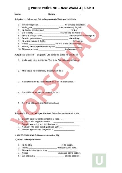 Arbeitsblatt: PROBEPRÜFUNG – New World 4 Unit 3