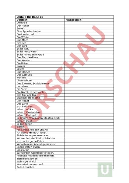 Unité 3 Dis Donc 7E Deutsch Die Erde Der Planet Erste/r Eine Sprache lernen Die Landschaft Die Wüste Das Meer Der See Der Berg Es ist kalt. Es ist heiss/warm Es ist minus zehn Grad Das Eis, die Glace Das Wasser Die Reise dauern kosten Das Fleisch Das Gemüse wohnen übernachten Das Zimmer, Schlafzimmer brauchen Ein Stern Die Nacht, in der Nacht Der Tag, am Tag Zweimal pro Woche Der Monat Das Land sich befinden In/nach Afrika In/nach Deutschland In/nach Portugal In die/den Vereinigten Staaten (USA) In/nach Genf In den Ferien gehen Am Strand /an den Strand Ich werde ein Buch lesen. Sich bräunen/sonnenbaden Wir werden die Stadt entdecken. Ich mache gerne Fotos. Wir gehen am Abend gerne aus. Spezialitäten essen um zu, für Wir werden Abenteuer erleben. Ausflüge mit dem Velo machen. Tiere beobachten Wohin gehst du? Was wirst du machen? Paris besuchen Französisch Wir werden im Hotel schlafen. Das Zelt Eine Insel Der Laden, das Geschäft Der Schnee Der Wald mieten Eine Ferienwohnung spektaktulär In der Nähe des Strandes Die Kleider Legen, stellen, anziehen In meinem Koffer hat es einen Pullover. Die Hose Das T-Shirt Die Unterwäsche Die Socken Die Jacke Die Shorts schön Das Kleid Das Badezeug Das Hemd Die Schuhe Die Turnschuhe Die Schirmmütze Ein Schal Die Handschuhe Das Necessaire Die Handtasche Der Reisepass Ein Fotoapparat Die Sonnencreme Die Sonnenbrille Die Spiele Das Ladegerät