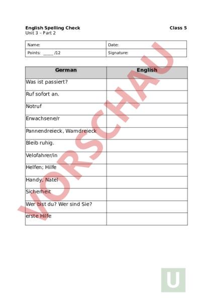 English Spelling Check Unit 3 – Part 2 Class 5 Name: Date: Points: /12 Signature: German Was ist passiert? Ruf sofort an. Notruf Erwachsene/r Pannendreieck, Warndreieck Bleib ruhig. Velofahrer/in Helfen; Hilfe Handy, Natel Sicherheit Wer bist du? Wer sind Sie? erste Hilfe English