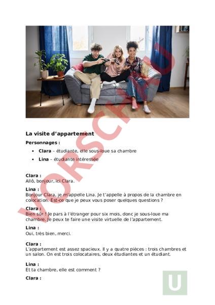 La visite dappartement Personnages Clara – étudiante, elle sous-loue sa chambre Lina – étudiante intéressée Clara Allô, bonjour, ici Clara. Lina Bonjour Clara, je mappelle Lina. Je tappelle à propos de la chambre en colocation. Est-ce que je peux vous poser quelques questions Clara Bien sûr Je pars à létranger pour six mois, donc je sous-loue ma chambre. Je peux te faire une visite virtuelle de lappartement. Lina Oui, très bien, merci. Clara Lappartement est assez spacieux. Il a quatre pièces trois chambres et un salon. On est trois colocataires, deux étudiantes et un étudiant. Lina Et ta chambre, elle est comment Clara Cest la chambre qui donne sur la cour, donc cest la plus calme de lappartement. Elle est aussi plus lumineuse que les deux autres chambres. Il a un lit, un bureau et une grande armoire. Lina Ça mintéresse beaucoup. Est-ce que cest aussi le meilleur endroit pour travailler Clara Oui, clairement. Le salon est moins calme, surtout le soir. Lina Justement, le salon, vous lutilisez souvent Clara Oui, cest lendroit le plus fréquenté de lappartement. On sy retrouve pour manger ensemble ou regarder des films. Lina Est-ce quil a un balcon Clara Oui, et cest le plus beau coin de lappartement. Il a une vue sur le parc. Lina Génial Et la cuisine Clara La cuisine est aussi grande que le salon. Elle est bien équipée, mais cest aussi la pièce la plus utilisée, donc on fait attention au ménage. La seule règle, cest que chacun nettoie après avoir cuisiné. Lina Cest normal. Et la buanderie Clara Elle est au sous-sol. Ce nest pas la plus moderne, mais elle est pratique et rarement occupée. Lina Comment est organisé le ménage Clara On un plan de ménage. Ce nest pas la partie la plus amusante, mais cest la plus efficace pour éviter les problèmes. Lina Daccord. Jaimerais aussi savoir quel est le prix de la chambre Clara Le loyer est de 420 euros par mois, charges comprises. Cest moins cher que beaucoup dautres chambres dans le quartier. Lina Et la durée de la sous-location Clara De mars à août. Cest la durée idéale pour un semestre à luniversité. Lina Parlons un peu du quartier. Il est comment Clara Cest lun des quartiers les plus agréables pour les étudiants. Lina Et les voisins Clara Ils sont plutôt plus âgés que nous, donc ils aiment le calme. On fait attention au bruit, surtout le soir. Lina Honnêtement, cest loffre la plus intéressante que jai vue jusquà présent. Est-ce que je pourrais visiter lappartement en vrai Clara Bien sûr On peut fixer un rendez-vous cette semaine, disons samedi à quatre heures Lina Parfait, merci beaucoup Clara. À très bientôt Clara À bientôt, avec plaisir Comparatif et Superlatif