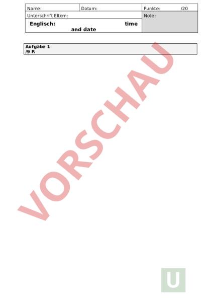 Name: Datum: Punkte: Unterschrift Eltern: Note: Englisch: time and date Aufgabe 1 /9 P. /20 What time is it? Schreibe die Uhrzeit als ganzen Satz hin. Aufgabe 2 /6 P. Write the following dates in words (British English). 16.05.2025 01.09.2024 25.12.2025 02.10.2023 11.01.2025 31.08.2022 Aufgabe 3 /2 P. Translate into German. July fourth, 2025 November eleventh, 2024 January first, 2023 Aufgabe 4 /2 P. Erkläre den Unterschied zwischen der Britischen und der Amerikanischen Schreibweise des Datums. (2 points) Fertig? Zeichne deine Lieblingsjahreszeit und was daran besonders ist.