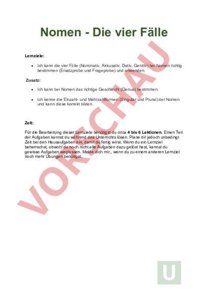 Nomen Die vier Fälle Lernziele: • Ich kann die vier Fälle (Nominativ, Akkusativ, Dativ, Genitiv) bei Nomen richtig bestimmen (Ersatzprobe und Frageprobe) und anwenden. Zusatz: • Ich kann bei Nomen das richtige Geschlecht (Genus) bestimmen. • Ich kenne die Einzahl- und Mehrzahlformen (Singular und Plural) der Nomen und kann diese korrekt bilden. Zeit: Für die Bearbeitung dieser Lernziele benötigst du circa 4 bis 6 Lektionen. Einen Teil der Aufgaben kannst du während des Unterrichts lösen. Plane dir jedoch unbedingt Zeit bei den Hausaufgaben ein, damit du fertig wirst. Wenn du ein Lernziel beherrschst, obwohl du noch nicht alle Aufgaben dazu gelöst hast, kannst du gewisse Aufgaben weglassen. Melde dich mir,, wenn du zu einem anderen Lernziel noch mehr Übungen benötigst. Nomen Repetition Nomen zeichnen sich durch vier Eigenschaften aus: Sie werden gross geschrieben, haben ein Geschlecht (der, die, das), können in der Einzahl oder Mehrzahl stehen und in vier verschiedene Fälle gesetzt werden (deklinierbar). 1. Erkennung und Grosschreibung von Nomen Ob es sich bei einem Wort um ein Nomen handelt, können wir mit der Artikelprobe feststellen. Setze der die oder das vor ein Wort, welches du bestimmen willst. Beispiel: Ich höre gerne Musik. à Ich höre gerne die Musik. à Musik ist ein Nomen. Nomen werden gross geschrieben. Auch aus anderen Wortarten können Nomen entstehen. Beispiel nominalisiertes Verb: Das Tanzen macht mir viel Freude. 2. Das Geschlecht – der, die oder das? Jedes Nomen hat ein grammatisches Geschlecht: der, die oder das. (Dieses kann sich je nach Fall auch verändern.) 3. Einzahl (Singular) – Mehrzahl (Plural) Jedes Nomen kann im Singular (Einzahl) oder im Plural (Mehrzahl) stehen. 4. Typische Endungen Wörter mit den Endungen -HEIT, -KEIT, -SCHAFT, -TUNG, -NIS, -TUM sind stets Nomen. 5. Abstrakte und konkrete Nomen Nomen können in zwei Gruppen eingeteilt werden. Konkrete Nomen bezeichnen Dinge, die man sehen, berühren und fühlen kann. Beispiele sind Lebewesen, Sachen und Namen. Abstrakte Nomen bezeichnen Dinge, die wir nur denken und empfinden können. Beispiele sind Gefühle. Die vier Fälle Jedes Nomen kann in vier verschiedenen Fällen stehen. Die vier Fälle heissen: 1. Nominativ 2. Akkusativ 3. Dativ 4. Genitiv Wer-Fall Wen-Fall Wem-Fall Wes-Fall (Wer oder was?) (Wen oder was?) (Wem?) (Wessen?) der Baum den Baum dem Baum des Baumes Um den Fall eines Nomens zu bestimmen, gibt es zwei Möglichkeiten: Du kannst die Frageprobe oder die Ersatzprobe anwenden. a) Frageprobe Beispielsatz: Der Fussballspieler hat dem Trainier den Ball des anderen Teams zugespielt. Nominativ: Wer (oder was) hat dem Trainer den Ball des anderen Teams zugespielt? à der Fussballspieler „Fussballspieler ist also ein Nomen, das im Nominativ steht. Akkusativ: Wen (oder was) hat der Fussballspieler dem Trainer zu gespielt? à den Ball (des anderen Teams) „Ball ist also ein Nomen, das im Akkusativ steht. Dativ: Wem hat der Fussballspieler den Ball des anderen Teams zugespielt? à dem Trainer „Trainer ist also ein Nomen, das im Dativ steht. Genitiv: Wessen Ball hat der Fussballspieler dem Trainer zugespielt? à(den Ball) des anderen Teams „Teams ist also ein Nomen, das im Genitiv steht. Wenn du die Frage formulierst, kommt also immer zuerst das Fragewort und dann das Verb (Personalform) und dann der Rest des Satzes. b) Ersatzprobe Eine weitere Methode um den Fall zu bestimmen ist die Ersatzprobe. Du ersetzt jedes Nomen mit einem männlichen Nomen (in der Einzahl!), z.B. Baum. Dann kannst du am Artikel (der, den, dem, des) ablesen, in welchem Fall das Nomen steht: der (Nominativ), den (Akkusativ), dem (Dativ), des (Genitiv). Die Katze läuft über die Strasse. In welchem Fall steht „die Katze? Ich ersetze „die Katze mit „Baum und dann heisst es: Der Baum läuft über die Strasse. Nun kann ich am Artikel (der Baum) ablesen, in welchem Fall „Katze steht. à die Katze steht also im Wer-Fall bzw. Nominativ. Die Katze läuft über die Strasse. In welchem Fall steht „die Strasse? Ich ersetze „die Strasse mit „Baum und dann heisst es: Die Katze läuft über den Baum. Nun kann ich am Artikel (den Baum) ablesen, in welchem Fall „Strasse steht. à die Strasse steht also im Wen-Fall bzw. Akkusativ. Jetzt bist du dran! Die Schüler schauen aus dem Fenster. In welchem Fall steht „die Schüler? Ich ersetze „die Schüler mit „Baum und dann heisst es: . . . . Die Schüler schauen aus dem Fenster. In welchem Fall steht „dem Fenster? Ich ersetze „dem Fenster mit „Baum und dann heisst es: . . . . NOMINATIV Das Gespenst geistert herum. (Werfall) Wer (oder was) geistert herum? Das Gespenst. GENITIV (Wesfall) Die Farbe des Gespenstes ist schwarz. DATIV (Wemfall) Bist du dem Gespenst schon begegnet? Wessen Farbe ist schwarz? Die Farbe des Gespenstes. Wem bist du schon begegnet? Dem Gespenst. AKKUSATIV Jetzt habe ich das Gespenst gesehen. (Wenfall) Wen habe ich gesehen? Das Gespenst. Aufgabe 1: Bestimme den Fall mit der Ersatzprobe so wie in Beispiel a). Beispiel: a) Das Segelschiff (der Baum) kämpfte gegen den starken Wind (den starken Baum). è Das Segelschiff Nominativ è Den starken Wind Akkusativ b) è è c) è è d) è è e) è è f) è è Aufgabe 2: Bestimme den Fall. IN WELCHEM FALL STEHT DAS NOMEN „JÄGER? Der Jäger lauert hinter einem Baum. Die Flinte des Jägers ist geladen. Doch kein Reh zeigt sich dem Jäger. Die Rehe haben den Jäger längst gesehen. IN WELCHEM FALL STEHT DER ZAUBERER? Die Darbietungen des Zauberers sind einzigartig. Den Zauberer musst du gesehen haben. Staunend wirst du dem Zauberer zusehen. Der Zauberer wird gleich auftrete IN WELCHEM FALL STEHT DER LÖWE? Hörst du den Löwen brüllen? Der Löwe hat Hunger. Die Mahlzeit des Löwen besteht aus Fleisch. Der Wärter bringt dem Löwen das Fressen. Die Leute stehen vor dem Käfig des Löwen. Der Löwe verschlingt das Fleisch 1 Aufgabe 3: Bestimme den Fall mit der Frageprobe so wie in B