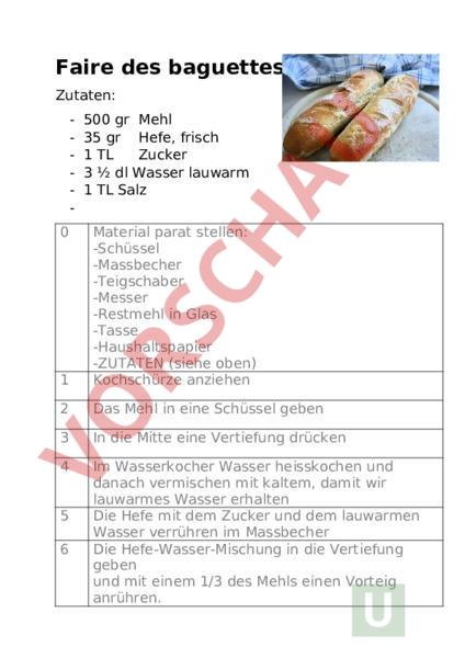 Faire des baguettes Zutaten: 0 500 gr Mehl 35 gr Hefe, frisch 1 TL Zucker 3 dl Wasser lauwarm 1 TL Salz 1 Material parat stellen: -Schüssel -Massbecher -Teigschaber -Messer -Restmehl in Glas -Tasse -Haushaltspapier -ZUTATEN (siehe oben) Kochschürze anziehen 2 Das Mehl in eine Schüssel geben 3 In die Mitte eine Vertiefung drücken 4 Im Wasserkocher Wasser heisskochen und danach vermischen mit kaltem, damit wir lauwarmes Wasser erhalten Die Hefe mit dem Zucker und dem lauwarmen Wasser verrühren im Massbecher Die Hefe-Wasser-Mischung in die Vertiefung geben und mit einem 1/3 des Mehls einen Vorteig anrühren. 5 6 7 20 Minuten gehen lassen 8 Das Salz auf dem Mehlrand verteilen 9 Alles von der Mitte her miteinander verkneten. Den Teig solange durchkneten, bis er schön glänzt und sich vom Schüsselboden löst. Zugedeckt mit einem Küchentuch 45 Minuten gehen lassen Backofen vorheizen auf 220 Grad Celsius 10 11 12 13 Den Teig auf einer bemehlten Arbeitsfläche in 4 Stücke teilen Daraus je eine 25 cm lange Rolle formen 14 Nochmals 15 Minuten gehen lassen 15 Ein Bachblech mit Backpapier belegen 16 Das Backpapier mit wenig Butter auf Haushaltspapier ausstreichen, dort wo Baguette draufliegen werden Die Rollen nebeneinander darauflegen und jeweils vier bis fünfmal schräg einschneiden eine Tasse heisses Wasser in den vorgeheizten Backofen stellen und das Blech mit den Baguettes hineinschieben 15 Minuten bei 220 Grad Celsius backen 17 18 19 20 Die Brote aus dem Ofen nehmen, sofort mit heissem Wasser bestreichen und zum Abkühlen auf eine Kuchengitter legen Bon appétit!