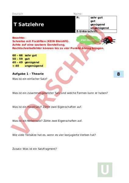 Deutsch Name: P: Satzlehre sehr gut gut genügend ungenügend E-Unterschrift: Beachte: Viel Glück! Schreibe mit Fixstiften (KEIN Bleistift). Achte auf eine saubere Darstellung. Rechtschreibefehler können bis zu vier Punkte Abzug bringen. 60 – 66 50 – 59 40 – 49 40 sehr gut gut genügend ungenügend Aufgabe 1 Theorie Was ist ein einfacher Satz? Was ist ein zusammengesetzter Satz und welche Formen kann er haben? Was ist ein Hauptsatz? Zähle zwei Eigenschaften auf. Was ist ein Nebensatz? Zähle zwei Eigenschaften auf. Wie viele Teilsätze hat es, wenn es vier konjugierte Verben hat? Zusatz: Was ist ein Satzfragment? 8 Aufgabe 2 – Hauptsätze erkennen Unterstreiche alle Hauptsätze mit Massstab/Geodreieck. 8 a) Die Indianer landeten mit der grössten Sorgfalt, damit die dünnen Rindenboote nicht beschädigt würden. b) Als die beiden Kinder zum Lagerplatz der Familie zurückkehrten, stand das Zelt schon fertig da. c) Das karge Geld, das ihm die Pelze eintrugen, legte er auf die Seite. d) Unter dem grössten Kessel, den sie besassen, wurde ein Feuer entzündet. e) Ich bin froh, dass du endlich kommst. f) Ich warte nun bereits seit einer Viertelstunde, meine Geduld ist bald am Ende. g) Wenn du dich verspätest, könntest du dich wenigstens telefonisch melden. h) Hast du die Texte mitgebracht? Aufgabe 3 – Satzverbindung oder Satzgefüge erkennen Schreibe bei den Sätzen dazu, ob es sich um eine Satzverbindung (HS HS) oder um ein Satzgefüge (HS NS) handelt. Du kannst SV oder SG verwenden. a) Er wird zur Schule kommen, wenn er wieder gesund ist. b) Das Papierflugzeug fliegt nicht mehr, weil ich es aus Versehen nass gemacht habe. c) Mein Vater muss nicht mit dem Auto zur Arbeit fahren, er kann das Fahrrad benutzen. d) Die Mädchen verlassen den Chor, denn sie haben bald Tanzunterricht. e) Mein Taschengeld reicht nicht, weil ich immer zu viel ausgebe. 5 Aufgabe 4 – Nebensätze erkennen, Kommas setzen In den folgenden Sätzen fehlen die Kommas zwischen Hauptsatz und Nebensatz bzw. zwischen Nebensatz und Hauptsatz. Unterstreiche zuerst die Nebensätze. Setze dann die Kommas an der richtigen Stelle ein. 11 Inspektor Carter ist in den Konferenzraum des Gloriahotels bestellt worden weil ein Informant ihm dort wichtige Informationen zur Lösung eines Falles geben will. Sehr zu seiner Verwunderung stellt er fest dass dort gerade ein Architektenkongress stattfindet. Als Carter den Saal betritt spricht der Redner gerade folgende Worte: „Diese Häuser werden ,passiv‘ genannt weil der überwiegende Teil des Wärmebedarfs aus ,passiven‘ Quellen gedeckt wird. Carter schaut unauffällig in die Runde ob einer der Zuhörer sein Informant sein könnte. Er hört nur so lange zu bis er neben seinem Stuhl einen Umschlag mit seinem Namen entdeckt. Als er den Zettel aus dem Umschlag zieht liest er diese folgenden scheinbar sinnlosen Sätze: a) Gehen Sie nicht in die Oper obwohl die Fische es nicht bemerken würden. b) Spucken Sie nicht ins Aquarium falls Sie diese Anweisungen nicht verstanden haben. c) Setzen Sie sich so hin weil Sie nicht singen können. d) Gehen Sie nach Hause und warten Sie dass Sie den Redner sehen können. Aufgabe 5 – Nebensätze bestimmen 5 Bestimme folgende Nebensätze nach: Infinitivsatz IS Relativsatz RS Indirekter Fragesatz IF Konjunktionalsatz KS a) Ich gehe ins Bett, weil ich müde bin. b) Das ist der Mann, den ich gestern getroffen habe. c) Er fragt, ob er mitkommen darf. d) Obwohl es regnete, gingen wir spazieren. e) Er hofft, die Prüfung zu bestehen. Aufgabe 6 – Aus zwei Sätzen einen machen Mache aus den beiden Sätzen ein Satzgefüge (HS NS oder NS HS). 4 a) Tina beobachtete: Ein fremder Junge hat am Radständer gestanden. b) Dann hat sie noch gesehen: Der Junge ist weggelaufen. c) Tina hat dem Hausmeister erzählt: Der Junge hat sich auffällig verhalten. d) Dann haben die beiden bemerkt: Drei Räder haben einen Platten. Aufgabe 7- Kommas in Schachtelsätzen richtig setzen Ergänze mit dem Komma an passender Stelle a) Nachdem alle ihre Rücksäcke gepackt hatten und sich regenfeste Kleidung die auch einem wirklichen Schauer standhält angezogen hatten wanderten wir am ersten Tag unserer Klassenfahrt zum Sorpesee um dort eine Kanufahrt zu machen. 19 b) Am Abend empfing uns in der Jugendherberge der Herbergsvater der uns nachdem wir über die Hausordnung aufgeklärt worden waren unsere Zimmer zeigte. c) Obwohl unser Klassenlehrer der unsere Klassenfahrt geplant hat in der Nacht kaum ein Auge zugemacht hat sah er am Morgen topfit aus weil er fünf Minuten kalt geduscht hatte. d) Weil wir am vorletzten Tag eine Tropfsteinhöhle die sich in der Nähe des Sorpesees befindet besuchen wollten mussten wir sehr früh aufstehen. e) Ich überlege mir dauernd dass diese Übung an der ich gerade sitze eigentlich ein völliger Blödsinn ist aber das darf ich nicht laut sagen sonst ärgert sich meine Lehrerin. Aufgabe 8 – Schachtelsätze erstellen Erstelle sinngemäss richtige Schachtelsätze. Mein Bruder wohnt in St. Gallen. Er hat eine weisse Katze. Die weisse Katze schnurrt unaufhörlich. Meine Mutter hat heute Geburtstag. Sie wohnt im Thurgau. Sie liebt Zitronenkuchen. Die Schüler bekommen vor Aufregung rote Köpfe. Die Lehrerin hat sich komplizierte Sätze ausgedacht. Sie sitzt gerne am Computer. Die Schüler knobeln an Teilsätzen herum. 7