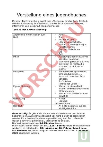 Vorstellung eines Jugendbuches Mit einer Buchvorstellung macht man «Werbung» für das Buch. Deshalb soll der Buchvortrag Schüler/innen, die das Buch noch nicht kennen, informieren und sie darauf neugierig machen. Teile deiner Buchvorstellung: Allgemeine Informationen zum Buch Inhalt Leseprobe Eigene Meinung Gestaltung Handout Autor Titel Art des Buches (Abenteuergeschichte) Aufbau, Schwierigkeitsgrad Hauptpersonen, Figurenkonstellation Ort Zeit Handlung (aber nicht zu viel verraten, den Inhalt spannend gestalten z.B. Wird die Heldin es rechtzeitig schaffen, das Rätsel zu lösen?» Ein besonders spannender, schöner, typischer, Ausschnitt aus dem Buch vorlesen. 2 – 3 Seiten (unbedingt üben!!) Warum ist dieses Buch lesens- und empfehlenswert? Stellungnahme Warum hast du dieses Buch gewählt? Plakat Lapbook Siehe Fotos A4-Seite gestalten mit den wichtigsten Infos Ganz wichtig: Es geht nicht darum, wer am besten aus dem Internet kopieren kann. Auch der Klappentext soll nicht einfach abgeschrieben werden. Entscheidend ist deine eigene Meinung zum Buch. Gestalte deinen Buchvortrag individuell, spannend und originell. Der Vortrag soll zwischen 5–8 Minuten dauern. Die Präsentationen finden am 15./16./17. Februar statt. Die Reihenfolge wird per Los entschieden. Alle müssen am 16. Februar bereit sein. Das Handout mit den wichtigsten Informationen muss am 12. Februar 2026 abgegeben werden. Ideen zur Gestaltung von Plakaten oder Lapbooks Platz für deine Notizen: Platz für deine Notizen: Platz für deine Notizen: