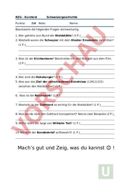 Arbeitsblatt: Kurztest Schweizergeschichte