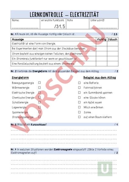 LERNKONTROLLE – ELEKTRIZITÄT Name: erreichte Punktzahl Note Unterschrift /31.5 Nr. 1 Kreuze an, ob die Aussage richtig oder falsch ist. 2.5 Aussage richtig falsch Elektrizität ist eine Form von Energie. Bei Experimenten darf man Strom aus der Steckdose benutzen. Strom besteht aus winzigen keinen Teilchen, den Elektronen. Ein Stromkreis funktioniert nur wenn er geschlossen ist. Eine Parallelschaltung besteht aus einem Stromkreis. Nr. 2 Verbinde die Energieform mit dem passenden Beispiel aus dem Alltag. Energieform /2 Beispiel aus dem Alltag Bewegungsenergie £ £ eine Batterie Wärmeenergie £ £ Fahrrad fahren Elektrische Energie £ £ ein Gummiband spannen Chemische Energie £ £ eine Glocke hören Schallenergie £ £ ein Apfel essen Lageenergie £ £ Milch erwärmen Spannenergie £ £ Sonne Strahlungsenergie £ £ auf einen Baum klettern Nr. 3 Was ist ein Kurzschluss? /1 Nr. 4 In welchen Situationen werden Elektromagnete eingesetzt? Zähle 2 Vorteile eines Elektromagneten auf? /2 Nr. 5 Zeichne einen korrekten Schaltplan einer Serienschaltung. Zähle die Merkmale einer Serienschaltung auf und nenne ein Beispiel aus dem Alltag. Tipp: Zeichne nur das in deinen Schaltplan, was es unbedingt braucht. 3.5 Nr. 6 Zeichne einen korrekten Schaltplan einer Parallelschaltung. Zähle die Merkmale einer Parallelschaltung auf und nenne ein Beispiel aus dem Alltag. /4 Nr. 7 Elektrischer Strom kann gefährlich sein. Schreibe vier Regeln auf, die man unbedingt beachten sollte. /2 Nr. 8 Schaltpläne. Baue einen Stromkreis mit zwei Lämpchen und einem Schalter. Ein Lämpchen soll dauernd leuchten, das zweite Lämpchen soll ein- und ausgeschaltet werden können. Die Lämpchen leuchten beide normal hell. Gib eine Erklärung zum gezeichneten Schaltplan: Was passiert, wenn du die Lampe 3 rausdrehst? Was passiert, wenn du die Lampe 3 rausdrehst? /4 Zeichne den passenden Schaltplan: Nr. 9 Erkläre die Funktion der einzelnen Kabel. Braune Ader: /3 Blaue Ader: Gelb-grüne Ader: Nr. 10 Zeichne bei beiden Schaltplänen ein, in welche Richtung der Strom fliesst. Nr. 11 Wie schliesse ich ein LED an eine Batterie an? Zeichne, beschrifte und erkläre. /1 /3 Nr. 12 Beschrifte die Glühlampe. 3.5