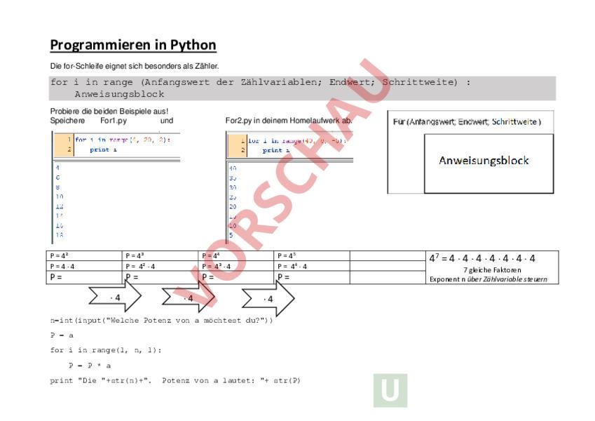 Programmieren in Python Die for-Schleife eignet sich besonders als Zähler. for in range (Anfangswert der Zählvariablen; Endwert; Schrittweite) Anweisungsblock Probiere die beiden Beispiele aus! Speichere For1.py und For2.py in deinem Homelaufwerk ab. 4 P44 4 4 4 44 4 4 45 44 4 P P P P 4 4 4 nint(input(Welche Potenz von möchtest du?)) for in range(1, n, 1): * print Die str(n). Potenz von lautet: str(P) 47 4 4 4 4 4 4 4 7 gleiche Faktoren Exponent über Zählvariable steuern
