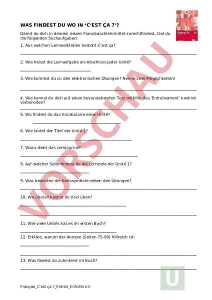 WAS FINDEST DU WO IN ‘CEST ÇA 7? Damit du dich in deinem neuen Französischlehrmittel zurechtfindest, löst du die folgenden Suchaufgaben: 1. Aus welchen Lernwerkteilen besteht Cest ça? 2. Wie heisst die Lernaufgabe als Abschluss jeder Unité? 3. Wie kommst du zu den elektronischen Übungen? Nenne zwei Möglichkeiten! 4. Wie kannst du dich auf einen bevorstehenden Test mithilfe des ‘Entraînement konkret vorbereiten? 5. Wo findest du das Vocabulaire einer Unité? 6. Wie lautet der Titel der Unité 1? 7. Wozu dient das Lernjournal? 8. Auf welcher Seite findest du die Lernziele der Unité 1? 9. Was bedeuten die Kreissymbole neben den Übungen? 10. Wo überall kannst du Voci üben? 11. Wie viele Unités hat es im ersten Buch? 12. Erkläre, warum der Annexe (Seiten 75-90) hilfreich ist: 13. Was findest du zuhinterst im Buch? Français_Cest ça 7_Entrée_N.Wüthrich 14. Wo findest du das Portfolio und wozu dient es? Français_Cest ça 7_Entrée_N.Wüthrich
