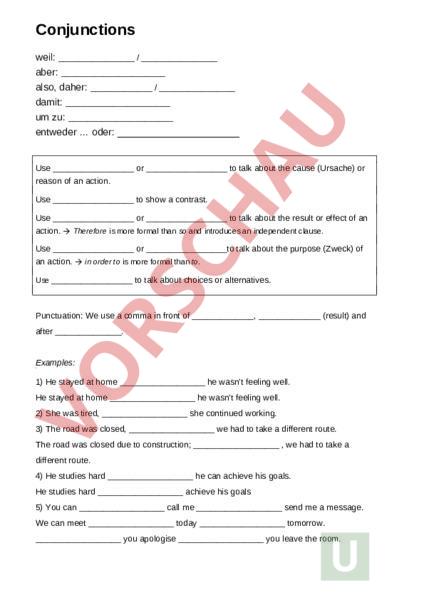 Conjunctions weil: aber: also, daher: damit: um zu: entweder oder: Use or to talk about the cause (Ursache) or reason of an action. Use to show contrast. Use or to talk about the result or effect of an action. Therefore is more formal than so and introduces an independent clause. Use orto talk about the purpose (Zweck) of an action. in order to is more formal than to. Use to talk about choices or alternatives. Punctuation: We use comma in front of, (result) and after . Examples: 4 1) He stayed at home he wasnt feeling well. He stayed at home he wasnt feeling well. 2) She was tired, she continued working. 3) The road was closed, we had to take different route. The road was closed due to construction; we had to take different route. 4) He studies hard he can achieve his goals. He studies hard achieve his goals 5) You can call me send me message. We can meet today tomorrow. you apologise you leave the room. Conjunctions weil: because since aber: but also, daher: so therefore damit: so (that) um zu: in order to entweder oder: either or Use because or since to talk about the cause (Ursache) or reason of an action. Use but to show contrast. Use so or therefore to talk about the result or effect of an action. Therefore is more formal than so and introduces an independent clause. Use so that or (in order) to to talk about the purpose (Zweck) of an action. in order to is more formal than to. Use either or to talk about choices or alternatives. Punctuation: We use comma in front of but, so (result) and after Therefore. Examples: 4 1) He stayed at home because he wasnt feeling well. He stayed at home since he wasnt feeling well. 2) She was tired, but she continued working. 3) The road was closed, so we had to take different route. The road was closed due to construction; therefore, we had to take different route. 4) He studies hard so (that) he can achieve his goals. He studies hard in order to achieve his goals 5) You can either call me or send me message. We can meet either today or tomorrow. Either you apologise or you leave the room.