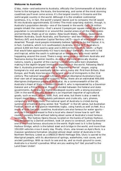 Welcome to Australia Gday, mate—and welcome to Australia, officially the Commonwealth of Australia: home to the kangaroo, the koala, the boomerang, and some of the most stunning coastlines youll ever come across. Its the largest country in Oceania and the sixth-largest country in the world. Although it is the smallest continental landmass, it is, in fact, the worlds largest island; just to compare, the UK would fit into Australia approximately 32 times! The most surprising statistic, though, is Australias population density—one of the lowest in the world. Only 26 million people inhabit the country—thats around 3 people per square meter. Most of the population is concentrated in or around the coastal areas of all the main states and territories. Made up of six states—New South Wales, Victoria, Queensland, Western Australia, South Australia, and Tasmania—and two territories—Northern Territory (NT) and Australian Capital Territory (ACT)—much of inland Australia is deserted. Though most people mistakenly believe Sydney to be the capital, it is, in fact, Canberra, which is in southeastern Australia, in the ACT. Australia is almost 4,000 km from east to west and 3,200 km from north to south—a flight that would take approximately 4.5 hours each way! Generally, the north is hot and tropical, while the south is subtropical or temperate, with most rainfall happening around the coast. There is even some snow in southern Australia and Tasmania during the winter months. As one of the most ethnically diverse nations, nearly quarter of the countrys inhabitants were born elsewhere, making it the eighth-largest immigrant population in the world. Following World War II, Australia promoted itself with Populate or Perish slogan, urging foreigners to visit and eventually settle—which many did. First from Britain, then Europe, and finally Asia became the largest source of immigrants in the 21st century. The national language is English, though Aboriginal Australians have their own set of languages and customs. Today, there are an estimated 400,000 Aborigines (Indigenous people of Australia). As commonwealth of the UK, Australias Head of State is Queen Elizabeth II, who is represented by GovernorGeneral and Prime Minister. Power is divided between the federal and state governments. Australia is highly developed country with strong economy— 13th in the world, actually. Australia is an important exporter of agricultural goods, such as wool, wheat, beef, fruit, and wine, but there is also need to import major items—most notably petroleum and crude oils, cars, phones, computers, and medicines. The national sport of Australia is cricket during summer and football during winter. Not football in the UK sense, but Australian Football, which at first glance resembles rugby, using hands as well as feet. As result of their fantastic coastline, Australians are also famous for water sports— and youll be hard-pressed to find local who doesnt know how to surf! We couldnt possibly finish without talking about some of Australias most famous landmarks. The Sydney Opera House, located on the banks of Sydney Harbour, was designed by Danish architect, took 14 years to construct, and has become one of the most famous structures in the world. Right next to it is the Sydney Harbour Bridge, which is the tallest steel arch bridge in the world, and more than 150,000 vehicles cross it every day. Finally, Uluru, also known as Ayers Rock, is massive sandstone formation situated almost dead center of Australia in the Northern Territory. Listed as UNESCO World Heritage Site, Uluru is sacred to the Aboriginal people, with its abundance of springs, waterholes, rock caves, and ancient paintings. With so much to see and do, and so much ground to cover, Australia is tourists paradise. What are you waiting for? Get yourself to the Land Down Under! Welcome to Australia Summary Australia is the largest country in Oceania Its the smallest continent but the largest island. The UK could fit into Australia about 32 times population is about 26 million, concentrated along the coasts. Comprises six states (NSW, Victoria, Queensland, Western Australia, South Australia, Tasmania) and two territories (NT, ACT) much of the interior is sparsely inhabited. Canberra is the capital, not Sydney. Vast distances: 4,000 km east–west and 3,200 km north–south ,a flight across takes about 4.5 hours. Climate: tropical in the north; subtropical in the south; most rain along coasts; some winter snow in southern regions and Tasmania. Highly diverse population: nearly quarter born overseas; policy encouraged immigration from Britain, Europe, and later Asia. English is the national language; Aboriginal Australians have distinct languages and customs; around 400,000 Indigenous people today. As UK Commonwealth, the Head of State is King Charles, represented by Governor-General; power is shared between federal and state governments. Advanced economy: exports include wool, wheat, beef, fruit, and wine; key imports include petroleum, cars, phones, computers, and medicines. Popular sports: cricket in summer, Australian Football in winter; strong beach culture and water sports, especially surfing. Iconic landmarks: Sydney Opera House (Danish design, 14 years to build), Sydney Harbour Bridge (tallest steel arch bridge; 150,000 vehicles daily), and Uluru (UNESCO site sacred to Aboriginal people). With diverse landscapes and attractions, Australia is promoted as travellers paradise.