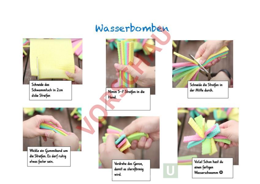 Wasserbomben Schneide das Schwammtuch in 2cm dicke Streifen Wickle ein Gummiband um die Streifen. Es darf ruhig etwas fester sein. Nimm 5-7 Streifen in die Hand. Verdrehe das Ganze, damit es sternförmig wird. Schneide die Streifen in der Mitte durch. Voila! Schon hast du einen fertigen Wasserschwamm