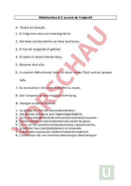 Millefeuilles 6.2 accord de ladjectif A. Traduis en français. 1. Er trägt eine rote und viereckige Brille. 2. Die Hose und das Hemd von Svea sind braun. 3. Er hat ein langes Buch gelesen. 4. Er wohnt in einem kleinen Haus. 5. Bananen sind süss. 6. In meinem Wohnzimmer habe ich einen runden Tisch und ein grosses Sofa. 7. Es ist praktisch mit einem Rollkoffer zu reisen. 8. Der Computer ist eine magische Erfindung. B. Souligne la bonne réponse. 1. 2. 3. 4. 5. 6. 7. 8. Le pelage du chat est douce/douces/doux. Les plumes doiseaux sont légère/léger/légères. Jai lu une bande dessinée amusant/amusante/amusantes. Jaime manger un bonne/bon/bonnes cornet de glace. Jai vu un film passionnant/passionnante passionnantes. Je préfère leau plat/plate/plates à la limonade. Il porte des chaussures modern/moderne/modernes. Lordinateur est une invention électronique /électroniques