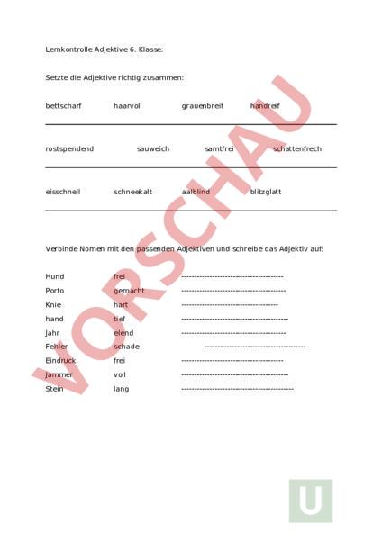 Lernkontrolle Adjektive 6. Klasse: Setzte die Adjektive richtig zusammen: bettscharf haarvoll rostspendend eisschnell sauweich schneekalt grauenbreit samtfrei aalblind handreif schattenfrech blitzglatt Verbinde Nomen mit den passenden Adjektiven und schreibe das Adjektiv auf: Hund frei ---------------------------------------- Porto gemacht ----------------------------------------- Knie hart -------------------------------------- hand tief ------------------------------------------ Jahr elend ----------------------------------------- Fehler schade Eindruck frei ---------------------------------------- Jammer voll ------------------------------------------ Stein lang -------------------------------------------- ----------------------------------------