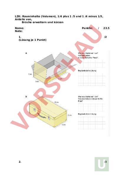 LZK: Rauminhalte (Volumen), 1/4 plus 1 /5 und 1 /4 minus 1/5, Anteile von, Brüche erweitern und kürzen Name: Note: Punkte: 23.5 1. (Lösung je 1 Punkt) /2 2. /3 (Volumen 1 Punkt; Oberfläche 2 Punkte) 3. /1.5 4. /1.5 5. /4.5 6. /2 7. 8. /2 /4 9. /3