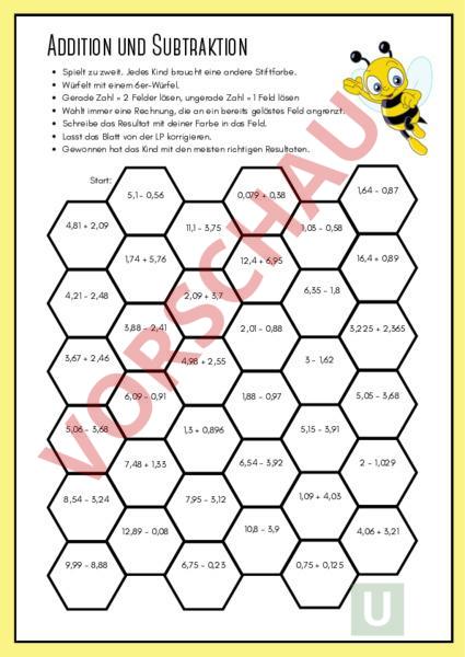 Addition und Subtraktion Spielt zu zweit. Jedes Kind braucht eine andere Stiftfarbe. Würfelt mit einem 6er-Würfel. Gerade Zahl 2 Felder lösen, ungerade Zahl 1 Feld lösen Wählt immer eine Rechnung, die an ein bereits gelöstes Feld angrenzt. Schreibe das Resultat mit deiner Farbe in das Feld. Lasst das Blatt von der LP korrigieren. Gewonnen hat das Kind mit den meisten richtigen Resultaten. Start: 5,1 0,56 4,81 2,09 11,1 3,75 1,74 5,76 4,21 2,48 6,35 1,8 2,01 0,88 6,09 0,91 5,05 3,68 1,88 0,97 5,15 3,91 1,3 0,896 6,54 3,92 7,48 1,33 8,54 3,24 3,225 2,365 3 1,62 4,98 2,55 5,06 3,68 16,4 0,89 12,4 6,95 3,88 2,41 2 1,029 1,09 4,03 7,95 3,12 10,8 3,9 12,89 0,08 9,99 8,88 1,03 0,58 2,09 3,7 3,67 2,46 1,64 0,87 0,079 0,38 6,75 0,23 4,06 3,21 0,75 0,125
