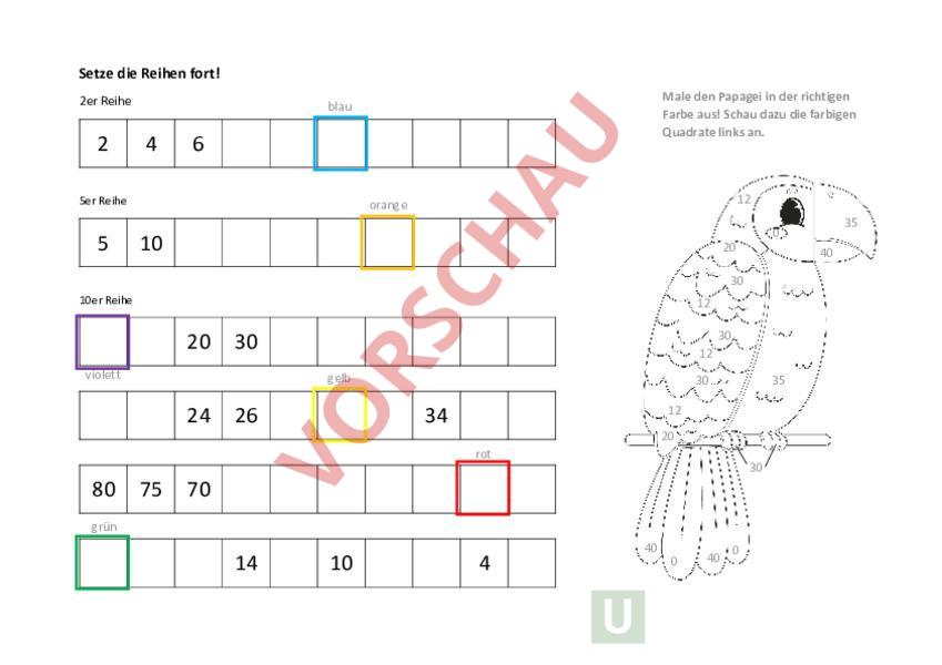 Setze die Reihen fort! 2er Reihe 2 4 6 5er Reihe 5 Male den Papagei in der richtigen Farbe aus! Schau dazu die farbigen Quadrate links an. blau 12 orange 10 20 40 30 10er Reihe 12 20 30 30 violett 12 gelb 24 26 30 35 12 34 20 rot 80 75 35 0 30 70 grün 14 10 4 40 0 40 0