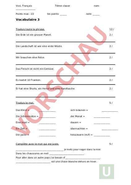 Voci, Français 7ième classe Points max 22 nom: tes points: note: Vocabulaire 3 Traduis toute la phrase. 12 Die Erde ist ein grosser Planet. 2/ Die Landschaft ist wie eine erste Wüste. 2/ Wir brauchen eine Reise. 2/ Das Fleisch ist nicht ein Gemüse. 2/ Es kostet 10 Franken. 2/ Er hat eine Shorts, ein Hemd und eine Handtasche. 2/ Traduis le mot. 5/ Das Kleid sich bräunen Die Schirmmütze der Monat Eine Insel dauern Ein Zelt übernachten Die Jacke heiss/warm (m/f) Complète avec le mot qui est juste. je mets pour nager dans la mer. Dans les chaussures on met . Pour aller dans un autre pays jai besoin d. est une chose blanche dehors en hiver. 5/ Voci, Français 7ième classe Points max 22 nom: tes points: note: Vocabulaire 3 Traduis toute la phrase. 12 Die Erde ist ein grosser Planet. La terre est une grande planète. Die Landschaft ist wie eine erste Wüste. Le paysage est comme un premier désert. Wir brauchen eine Reise. Nous avons besoin dun voyage. Das Fleisch ist nicht ein Gemüse. La viande nest pas un légume. Es kostet 10 Franken. Il coûte dix francs. Er hat eine Shorts, ein Hemd und eine Handtasche. Il un short, une chemise et un sac à main. Traduis le mot. Das Kleid 5/ la robe Die Schirmmütze la casquette Eine Insel une île Ein Zelt une tente Die Jacke la veste sich bräunen der Monat bronzer le mois dauern übernachten durer loger heiss/warm (m/f) chaud/chaude Complète avec le mot qui est juste. 5/ Le maillot de bain je mets pour nager dans la mer. Dans les chaussures on met les des chaussettes. (1.5) Pour aller dans un autre pays jai besoin dun passeport. (1.5) La neige est une chose blanche dehors en hiver.