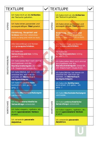 TEXTLUPE TEXTLUPE AUFBAU Ich habe einen passenden und aussagekräftigen Titel gesetzt. Ich habe mich an die Kriterien der Textsorte gehalten. Ich habe einen passenden und aussagekräftigen Titel gesetzt. Einleitung, Hauptteil und Schluss sind klar erkennbar, nicht zu lang und nicht zu kurz. Alle Satzanfänge und Nomen sind grossgeschrieben. Alle Satzanfänge und Nomen sind grossgeschrieben. Ich habe die Satzschlusszeichen richtig gesetzt (.,!?). Ich habe die Satzschlusszeichen richtig gesetzt (.,!?). Ich habe jedes Wort noch einmal durchgelesen und die Rechtschreibregeln überprüft, z.B. Dopplungen (ss,pp,ck,tz). Ich habe Wörter, bei denen ich unsicher bin, wie man sie schreibt, im Wörterbuch nachgeschlagen. RECHTSCHREIBUNG Einleitung, Hauptteil und Schluss sind klar erkennbar, nicht zu lang und nicht zu kurz. Ich habe jedes Wort noch einmal durchgelesen und die Rechtschreibregeln überprüft, z.B. Dopplungen (ss,pp,ck,tz). Ich habe Wörter, bei denen ich unsicher bin, wie man sie schreibt, im Wörterbuch nachgeschlagen. Ich habe die Zeitformen kontrolliert. (Ich gehe Ich ging.) Ich habe die Zeitformen kontrolliert. (Ich gehe Ich ging.) Ich habe Wortwiederholungen vermieden. Ich habe Wortwiederholungen vermieden. Ich habe unterschiedliche Satzanfänge verwendet. Ich habe unterschiedliche Satzanfänge verwendet. Ich habe «sagen», «gehen», etc. durch spannendere Verben ersetzt. Ich verwende passende Adjektive. WORTSCHATZ WORTSCHATZ RECHTSCHREIBUNG AUFBAU Ich habe mich an die Kriterien der Textsorte gehalten. Ich habe «sagen», «gehen», etc. durch spannendere Verben ersetzt. Ich verwende passende Adjektive.