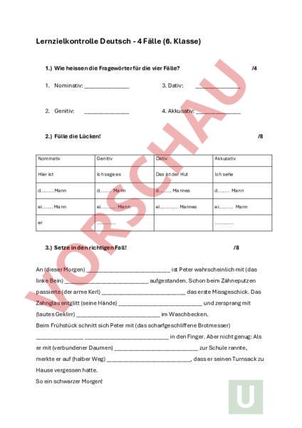Lernzielkontrolle Deutsch 4 Fälle (6. Klasse) 1.) Wie heissen die Fragewörter für die vier Fälle? /4 1. Nominativ: 3. Dativ: 2. Genitiv: 4. Akkusativ: 2.) Fülle die Lücken! /8 Nominativ Genitiv Dativ Akkusativ Hier ist Ich sage es Das ist der Hut Ich sehe d Mann d Mann d. Mannes d Mann ei Mann ei. Mann ei. Mannes ei Mann er . . 3.) Setze in den richtigen Fall! /8 An (dieser Morgen) ist Peter wahrscheinlich mit (das linke Bein) aufgestanden. Schon beim Zähneputzen passierte (der arme Kerl) das erste Missgeschick. Das Zahnglas entglitt (seine Hände) und zersprang mit (lautes Geklirr) im Waschbecken. Beim Frühstück schnitt sich Peter mit (das scharfgeschliffene Brotmesser) in den Finger. Aber nicht genug: Als er mit (verbundener Daumen) zur Schule rannte, merkte er auf (halber Weg) , dass er seinen Turnsack zu Hause vergessen hatte. So ein schwarzer Morgen! 4.) Bestimme die Fälle Nominativ N 10 Genitiv G Dativ D Akkusativ A Sonja nimmt im Selbstbedienungsladen zwei Schleckstängel vom Regal und lässt sie in der Hosentasche verschwinden. An der Kasse bezahlt Sonja nur das Brot, welches sie für ihre Mutter einkaufen musste. Max hat alles beobachtet. Er kennt Sonja. Sie wohnt im gleichen Haus wie er und geht ins gleiche Schulhaus. Letzte Woche auf dem Schulweg hat er sogar einmal ihren Rucksack getragen. Max sieht, wie Sonja vor dem Laden einen Schleckstängel aus der Tasche zieht und in den Mund steckt. Während des Schleckens schlendert sie langsam in die Schule. 5.) Setzte die Nomen richtig in die Sätze ein (mit Begleiter) 1. Heute geht in die Schule (Kind) 2. Wir suchen alle von Max. (Stift) 3. Marion hilft. (alte Mann) 4. Das ist die Hütte. (Hund) 5. ist heute krank. (Schülerin) /5 6.) Unterstreiche die Fehler mit grünem Farbstift! Korrigiere den Text und schreibe ihn dann korrekt auf die Linie! /8 Der Onkel des klein Elvis erwischt sein Neffen, als dieser vom seifig Wasser aus einem Badewanne trinken will. Er meint: „Tu das nicht, denn von der Seifenblasen bekommst dir sicher schreckliches Bauchschmerzen, den du nicht mehr wegkriegst. Selbsteinschätzung (kreuze an, was zutrifft) stimmt stimmt meistens stimmt manchmal stimmt gar nicht Du kennst die lateinischen Begriffe für die vier Fälle und deren Fragewörter? Du kannst die vier Fälle erkennen Du erkennst in einem Text die Fallfehler und kannst sie berichtigen. Du kennst die Ersatzprobe und kannst sie anwenden. Du kannst Wörter in einem Text in den richtigen Fall setzen. Diese Prüfung war für mich einfach mittel Meine Note in dieser Prüfung wird sehr gut gut schwierig genügend sehr schwierig. ungenügend Punkte: sein. /43 Note: Unterschrift der Eltern: Skala: 6: 42 5.5: 41 38 5: 37 33 4.5: 32 28 4: 27 24 3.5: 23 19 3:19