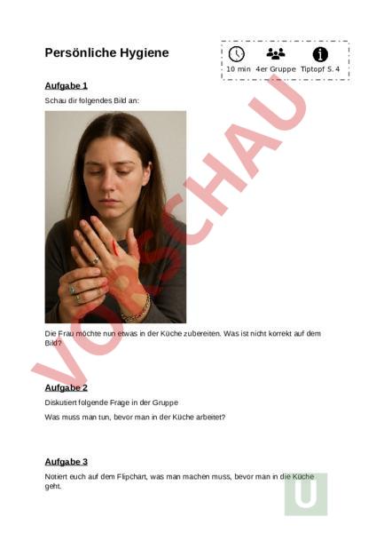 Stationenlehre für eine Gruppenarbeit im WAH zum Thema Hygiene gemäss Tiptopf. Persönliche Hygiene, Küchen- und Gerätehygiene, Nahrungsmittelhygiene.