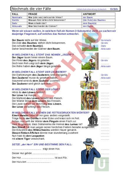 Nochmals die vier Fälle mittelschulvorbereitung.ch/deutsch FALL FRAGE ANTWORT Nominativ Genitiv Dativ Akkusativ Wer (oder was) steht auf der Wiese? Wessen Äste stehen dicht beisammen? Wem schadet das? Wen beschneidet der Gärtner? der Baum (die Äste) des Baumes dem Baum(e) den Baum Gr1bb Wenn wir wissen wollen, in welchem Fall ein Nomen (Substantiv) steht, so suchen wir dasjenige Fragewort, auf welches das Nomen antwortet. Der Baum steht auf der Wiese. Die Äste des Baumes stehen dicht beisammen. Das schadet dem Baum(e). Daher beschneidet der Gärtner den Baum. IN WELCHEM FALL STEHT DAS NOMEN „JÄGER? Der Jäger lauert hinter einem Baum. Die Flinte des Jägers ist geladen. Doch kein Reh zeigt sich dem Jäger. Die Rehe haben den Jäger längst gesehen. IN WELCHEM FALL STEHT DER ZAUBERER? Die Darbietungen des Zauberers sind einzigartig. Den Zauberer musst du gesehen haben. Staunend wirst du dem Zauberer zusehen. Der Zauberer wird gleich auftreten. IN WELCHEM FALL STEHT DER LÖWE? Hörst du den Löwen brüllen? Der Löwe hat Hunger. Die Mahlzeit des Löwen besteht aus Fleisch. Der Wärter bringt dem Löwen das Fressen. Die Leute stehen vor dem Käfig des Löwen. Der Löwe verschlingt das Fleisch. IN WELCHEM FALL STEHEN DIE FETTGEDRUCKTEN WÖRTER? Einen Marabu habe ich mir ganz anders vorgestellt. Träge hockt der Gorilla in einer Ecke und kratzt sich im Fell. Schau, nun wirft der Wärter dem Pinguin einen Fisch zu! Hast du gewusst, dass Südamerika die Heimat des Lamas ist? Den Strauß hat man wegen seiner herrlichen Federn beinahe ausgerottet. Die Eckzähne des Wildschweins werden Hauer genannt. Diesen flinken Äffchen könnte man stundenlang zusehen! Nun hast du den Leoparden mit einem Tiger verwechselt. Nominativ Genitiv Dativ Akkusativ Genitiv Akkusativ Genitiv Akkusativ . . SETZE „der Herr EIN UND BESTIMME DEN FALL: trägt einen Hut. Dieser Hut gehört Der Hut . ist aus Filz. Der Hut ziert .