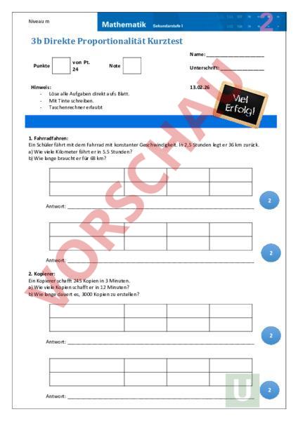 Niveau 3b Direkte Proportionalität Kurztest Name: Punkte von Pt. 24 Note Hinweis: Löse alle Aufgaben direkt aufs Blatt. Mit Tinte schreiben. Taschenrechner erlaubt Unterschrift: 13.02.26 1. Fahrradfahren: Ein Schüler fährt mit dem Fahrrad mit konstanter Geschwindigkeit. In 2,5 Stunden legt er 36 km zurück. a) Wie viele Kilometer fährt er in 5.5 Stunden? b) Wie lange braucht er für 68 km? Antwort: 2 2 Antwort: 2. Kopierer: Ein Kopierer schafft 245 Kopien in 3 Minuten. a) Wie viele Kopien schafft er in 12 Minuten? b) Wie lange dauert es, 3000 Kopien zu erstellen? Antwort: Antwort: 2 2 Niveau 3. Wasserbeförderung: Eine Pumpe fördert in 12 Minuten genau 2,4 m Wasser. a) Wie viel Wasser fördert sie in 35 Minuten? b) Wie lange braucht sie für 10 m Wasser? 2 Antwort: 2 Antwort: 4. Fahrradtraining: Ein Profifahrer hat eine konstante Geschwindigkeit. Er fährt 54 km in 1,5 Stunden. a) Berechne seine Geschwindigkeit in km/h. b) Wie weit kommt er in 4,2 Stunden? Antwort: 2 2 Antwort: Niveau 5. Bauarbeiten: Ein Team schafft 280 m Pflastersteine in 7 Stunden. Für ein grösseres Projekt müssen 960 m gelegt werden. a) Wie viele m schafft das Team pro Stunde? b) Wie lange dauert das gesamte grössere Projekt? 2 Antwort: Antwort: 2 6. Ernährung Rezeptskalierung: Ein Energieriegel-Rezept benötigt 350 Haferflocken für 5 Riegel. Die Menge ist direkt proportional. a) Wie viele Gramm Haferflocken benötigt man für 18 Riegel? b) Wie viele Riegel kann man mit 1,4 kg Haferflocken herstellen? Antwort: Antwort: 2 2