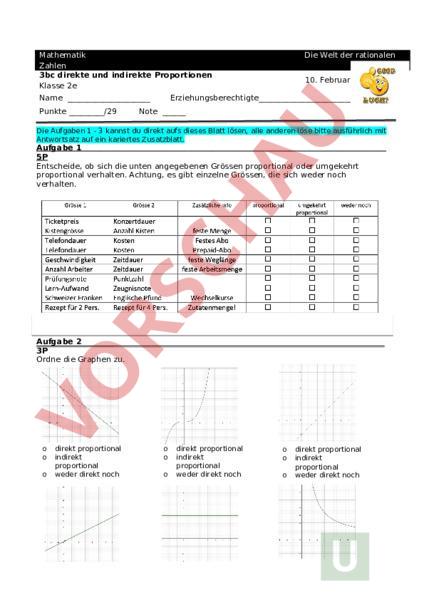Mathematik Zahlen 3bc direkte und indirekte Proportionen Klasse 2e Name Punkte/29 Die Welt der rationalen 10. Februar 2026 Erziehungsberechtigte Note Die Aufgaben 1 3 kannst du direkt aufs dieses Blatt lösen, alle anderen löse bitte ausführlich mit Antwortsatz auf ein kariertes Zusatzblatt. Aufgabe 1 5P Entscheide, ob sich die unten angegebenen Grössen proportional oder umgekehrt proportional verhalten. Achtung, es gibt einzelne Grössen, die sich weder noch verhalten. Aufgabe 2 3P Ordne die Graphen zu. o direkt proportional indirekt proportional weder direkt noch o direkt proportional indirekt proportional weder direkt noch o direkt proportional indirekt proportional weder direkt noch direkt proportional indirekt proportional Aufgabe weder3direkt noch o o direkt proportional indirekt proportional weder direkt noch o direkt proportional indirekt proportional weder direkt noch 2P Welche Aussage(n) sind richtig? a) Der Flächeninhalt eines Quadrates ist proportional zur Seitenlänge. b) Das Volumen eines Würfels ist proportional zur Kantenlänge. c) Der Umfang eines Quadrates ist proportional zur Seitenlänge. Richtige Aussage(n): Aufgabe 4 3P Ein Bauer schlägt alle 10m einen Pfosten ein und benötigt 96 Pfosten. a) Welchen Umfang hat das Rechteck? b) Wie viele Stangen braucht der Bauer, wenn er bei gleichem Umfang alle 12 einen Pfosten einschlagen will? c) Wie gross ist der Abstand zwischen zwei Posten, wenn bei gleichem Umfang bloss 30 Pfosten eingeschlagen werden? Aufgabe 5 4P Zwei Handwerker und bewerben sich um einen Auftrag, der zu einem festen Preis von 3900 Fr. ausgeführt werden soll. a) Wie viel Zeit dürfte jeder der beiden Handwerker für die Ausführung dieses Auftrages höchstens einplanen, wenn mit 75 Fr. pro und mit 78 Fr. pro Stunde gerechnet hat? b) Wie hoch wären die stündlichen Einnahmen von und von B, wenn es jedem gelänge, die eingeplante Zeit, um 1 zu unterbieten? 4 Aufgabe 6 2P Eine Wohnstube soll mit schönem Parkettboden belegt werden. Dabei kann man mit 1268 „Schindeln (also 1268 einzelne Holzstücklein) den Boden ganz belegen, wenn eine Schindel 1.5 cm breit ist. Leider haben die Hersteller zwar genau 1268 Schindeln geliefert, die aber leider nur 1.2 cm breit sind. Wie viele Schindeln müssen nachgeliefert werden, damit man den ganzen Boden belegen kann? Aufgabe 7 3P Das Einrichten eines Ladens soll von 16 Arbeitern in 24 Tagen erledigt werden. Nach 18 Tagen werden 4 Arbeiter krank. Wie viele Tag müssen nun noch an die 18 Tage angehängt werden, um den Auftrag zu erledigen? Aufgabe 8 4P Ein Getreidesilo fasst 300 Tonnen (t) Weizen. Es ist beinahe leer und wird gefüllt. Bei gleichmäßigem Zufluss befinden sich nach drei Stunden 137,5 Tonnen und nach sieben Stunden 237,5 Tonnen Weizen im Silo. a) Wie viel Tonnen Weizen waren vor der Befüllung bereits im Silo? b) Wie lange dauert es noch, bis das Silo komplett gefüllt ist? Aufgabe 9 3P Zum Ausheben einer Baugrube wird ein Bagger verwendet, der die gesamte Arbeit in 18 Tagen erledigen kann. Um etwas schneller voranzukommen, wird nach 7 Tagen ein zusätzlicher Bagger eingesetzt, der die gesamte Arbeit allein in 36 Tagen erledigen könnte. Wie lange dauert der gesamte Aushub?