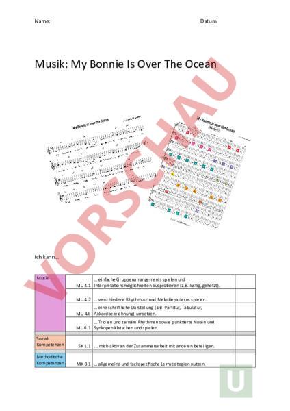Name: Datum: Musik: My Bonnie Is Over The Ocean Ich kann Musik einfache Gruppenarrangements spielen und MU 4.1 InterpretaDonsmöglichkeiten ausprobieren (z.B. lusDg, gehetzt). MU 4.2 verschiedene Rhythmus- und MelodiepaNerns spielen. eine schriftliche Darstellung (z.B. Partitur, Tabulatur, MU 4.6 Akkordbezeichnung) umsetzen. Triolen und ternäre Rhythmen sowie punkDerte Noten und MU 6.1 Synkopen klatschen und spielen. SozialKompetenzen Methodische Kompetenzen SK 1.1 . mich akDv an der Zusammenarbeit mit anderen beteiligen. MK 3.1 allgemeine und fachspezifische Lernstrategien nutzen.