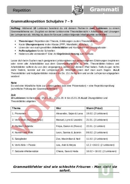 Grammati Repetition Grammatikrepetition Schuljahre 7 – 9 Auftrag: Während 10 Lektionen bereitest du mit deinem Partner:in zwei Lektionen zu einem Grammatikthema vor. Du gibst vor deiner Lektion eine Theorieübersicht Arbeitsblatt und Lösungen der Lehrperson ab. Wichtig ist, dass ihr für eure Lektion folgende Inhaltspunkte vorbereitet: Theorieinput: Repetition der Theorie, Erklärungen zu den Theorieblättern Kurze Übungssequenz in der Klasse (PPP, Wandtafel, Kärtchen, .) Lösen der von euch gewählten Arbeitsblätter und Korrigieren mit Lösungsdossier Pufferaufgaben für die Schnellen Haben es alle verstanden? Eine Art Ergebnissicherung zum Schluss Lasse dich beim Suchen nach geeigneten Lektionsideen von deinen eigenen Erfahrungen inspirieren oder nimm alte Arbeitsblätter aus dem Grammatikunterricht zu Hilfe. Theorieblätter-/videos und Arbeitsblätter solltest du von den vergangenen Jahren auf deinem IPad haben. Falls du gar nichts mehr findest, komme auf die Lehrperson zu. Mitschüler:innen darf man auch fragen. ALLE Theorieblätter und Aufgabenblätter müssen bis Do. 15.1 fertig sein und an die Lehrperson abgegeben werden! Note Es wird eine Mündliche Note zur Lektion geben (wie eine Präsentation) eine Repetitionsprüfung (schriftliche Prüfung der Grammatikthemen) Zeit 10 Lektionen Vorbereitung: 05.01.26 – 15.01.26 bis 15.01.26 ALLE Übungsblätter und Theorieblätter abgeben Thema Wer Wann (Präsi) 1. Pronomen Alexander, Sajan Lana 19.02. (2 Lektionen) 2. Verb Modi (Kon./Ind./Imp.) Manuel, Lynn Leandro 21.01. (2 Lektionen) 3. Partikel Adjektiv Finya, Dairon (Rocco) 22.01. (1 Lektion) 4. Nomen und Fälle Leon, Samira Jasmin 09.02. (2 Lektionen) 5. Satzglieder Zoe, Maximilian Noé 11.02. (2 Lektionen) 6. Verb Aktiv Passiv Lea, Ariel Meyra 12.2 16.02. (2 Lektionen) 7. Satzarten/Nebensätze Chiara, Sara Heda 16.02 18.02. (2 Lektionen) Grammatikfehler sind wie schlechte Frisuren Man sieht sie sofort. Repetition Grammati Lernziele 1. Pronomen 2. Verb Modi (Kon./Ind./Imp.) 3. Partikel Adjektiv 4. Interpunktion Rechtschreibung 5. Nomen und Fälle 6. Satzglieder 7. Verb Aktiv Passiv 8. Satzarten/Nebensätze -Du weisst, was Pronomen sind -Du kannst in einem Text Pronomen erkennen -Du kannst Pronomen in einem Text bestimmen (Allgemein Verb): Du kannst verschiedene Verben Sätze in die gewünschte Zeitform setzen oder die Zeit bestimmen. Du weisst, wie die Konjunktivformen (III) gebildet werden (Stamm und Endungen, Konj. II: Ein- und Zweiwortform) Du kannst den Konjunktiv und II zum Perfekt, Futur und Futur II bilden Du kannst Verbformen bestimmen nach Person, Zahl (Numerus), Modus und Zeit (Tempus) -Du weisst, was Adjektive und was Partikel sind -Du erkennst Adjektive in einem Satz -Du kennst Partikel (Untergruppen: Konjunktion, Präposition) -Du weisst, wann ein Komma und wann wie Anführungs- und Schlusszeichen gesetzt werden -Du kannst in einem Text Interpunktions- und Rechtschreibefehler finden und korrigieren Du kennst die vier Fälle und kannst diese benennen. Du bist in der Lage in einem Text die verschiedenen Fälle zu benennen. (Frageprobe oder Ersatzprobe) Du kannst vorgegebene Wörter in den richtigen Fall setzen. -Du kannst Einfacher Satz, Satzverbindungen, Satzgefüge, Zusammengezogene Sätze und Satzfragmente erklären -Du kennst die Satzglieder und kannst sie bestimmen Subjekt, versch. Objekt, Präpositionalgefüge, Adverbiale Du weisst, was ein Satzglied ist und kannst sie in einem Satz voneinander abtrennen (Verschiebeprobe) Du kannst die passiven und aktiven Verbformen in einem Text erkennen. Du kannst einen Satz in jeder Zeitform vom Aktiven ins Passive und umgekehrt umformen, ohne dass du die grammatische Zeit veränderst. Du kennst die drei Satzarten. Dir ist bewusst, was ein Haupt- und was ein Nebensatz ist und kannst diese unterscheiden. Du kennst die 6 verschiedenen Nebensatzarten und kannst diese beschreiben und bestimmen. Grammati Repetition Grammatikrepetition Vortrag 9. Klasse Name: Punkte: 38 2 1 0 Note: Auftreten/mündlicher Ausdruck Angemessenes Sprechtempo, Pausen Deutliche Aussprache, angenehme Lautstärke Freie Sprechweise, lebendige Stimmführung, Publikum sinnvoll miteinbeziehen Sprache Korrekter Sprachgebrauch, guter Stil Aufbau/Inhalt Klarer Aufbau, sichtbare Gliederung Vollständigkeit, Auswahl relevanter Themen Fachliche Korrektheit Verständlichkeit, angemess. Schwierigkeitsgrad Anschauungsmaterial (PPP) Hilfreicher Einsatz Darstellung Übungsmaterial und Theorieblatt Übersichtliche, einheitliche Darstellung Formale und fachliche Korrektheit Abdeckung des Themas, Variation der Übungen Angemessener Schwierigkeitsgrad Überarbeitung/Eigenleistung Unterrichtsarbeit Fokussierte saubere Arbeit im Unterricht Gleichwertige Arbeit in der Gruppe Kümmert sich um den Fortschritt in der Gruppe