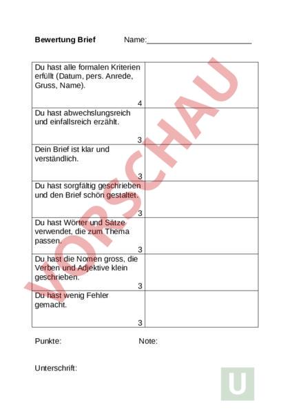 Bewertung Brief Name: Du hast alle formalen Kriterien erfüllt (Datum, pers. Anrede, Gruss, Name). 4 Du hast abwechslungsreich und einfallsreich erzählt. 3 Dein Brief ist klar und verständlich. 3 Du hast sorgfältig geschrieben und den Brief schön gestaltet. 3 Du hast Wörter und Sätze verwendet, die zum Thema passen. 3 Du hast die Nomen gross, die Verben und Adjektive klein geschrieben. 3 Du hast wenig Fehler gemacht. 3 Punkte: Unterschrift: Note: