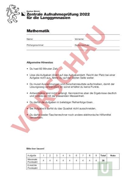 Kanton Zürich Zentrale Aufnahmeprüfung 2022 Kantondie Zürich Langgymnasien für Zentrale Aufnahmeprüfung 2022 für die Langgymnasien Mathematik Name: Mathematik Vorname: Prüfungsnummer: Name: Kantonsschule: Vorname: Prüfungsnummer: Kantonsschule: Allgemeine Hinweise: •Allgemeine Du hast 60Hinweise: Minuten Zeit. Du hast Minutendirekt Zeit. auf das Aufgabenblatt. Reicht der Platz bei einer •• Löse die 60 Aufgaben Aufgabe nicht aus, fährst du auf der letzten Seite weiter. • Löse die Aufgaben direkt auf das Aufgabenblatt. Reicht der Platz bei einer Aufgabe aus, fährst du aufZwischenresultate der letzten Seite weiter. • Du musstnicht Ausrechnungen und aufschreiben, damit der Lösungsweg verständlich ist; sonst erhältst du keine Punkte. • Du musst Ausrechnungen und Zwischenresultate aufschreiben, damit der Lösungsweg verständlich ist; sonstKennzeichne erhältst du keine • Antwortsätze sind nicht verlangt. aber Punkte. die Ergebnisse deutlich und notiere sie mit der passenden Masseinheit. • Antwortsätze sind nicht verlangt. Kennzeichne aber die Ergebnisse deutlich und notiere sie mit der passenden Masseinheit. • Du darfst die Aufgaben in beliebiger Reihenfolge lösen. • Du darfst die Aufgaben in beliebiger Reihenfolge lösen. • Bei Aufgabe 9 darfst du das Quadrat nicht ausschneiden. • Bei Aufgabe 9 darfst du das Quadrat nicht ausschneiden. • Du darfst weder Taschenrechner noch andere elektronische Hilfsmittel verwenden. • Du darfst weder Taschenrechner noch andere elektronische Hilfsmittel verwenden. Bitte leer lassen! Aufgabe Maximale Punktzahl Erreichte Punktzahl 1 2 3 4 5 6 7 8 9 Total 4 4 4 4 4 4 4 4 4 36 Note 1. Gib das Ergebnis an: (12.32 · 56) 100.8 (19 · 4.2) (56 · 7.68) Wenn du geschickt rechnest, kannst du den Rechenaufwand stark verringern. 2. Klima Der Monat Juli hat 31 Tage. In der folgenden Tabelle sind Hitzetage und Regentage immer verschiedene Tage. Kanton Zürich Juli 2014 Anzahl Hitzetage Juli 2015 Juli 2021 16 0 Anzahl Regentage 20 9 20 Anzahl Tropennächte 0 5 0 durchschnittliche Temperatur 17.5 1 8 17.6 der Hitzetage im Juli 2015. Wie viele Hitze- a) Die Anzahl Hitzetage im Juli 2014 beträgt tage gab es im Juli 2014? b) Wie viele Tage im Juli der drei Jahre 2014, 2015 und 2021 waren insgesamt weder Hitzetage noch Regentage? c) Der Mittelwert der drei Durchschnittstemperaturen beträgt 19.1 C. Wie viele Grad Celsius beträgt die Durchschnittstemperatur im Juli 2015? 3. Die nebenstehende Burg ist aus Würfeln von 1 cm Kantenlänge zusammengeklebt. Nur auf der Vorderseite hat es eine Tür und ein Fenster. a) Aus wie vielen Würfeln besteht die Burg? b) Wie viele Würfel der Burg berühren den Boden? c) Wie viele Würfel braucht es zusätzlich, um aus der Burg einen vollständig gefüllten Würfel mit 5 cm Seitenlänge zu erhalten? 4. In der Zehnuhrpause liegen Brezel bereit. 35 der Brezel sind mit Butter bestrichen, die restlichen nicht. Nur 73 von den Butterbrezeln werden gegessen. Daher bleiben 12 Butterbrezel übrig. Wie viele Brezel lagen insgesamt zu Beginn der Pause bereit? 5. Gabriela und Daria machen einen Ausflug ins Technorama. Gemeinsam laufen sie um 8.00 Uhr mit einer Geschwindigkeit von 6 km/h zur Tramstation los. Nach drei Minuten bemerkt Daria, dass sie ihr Portemonnaie vergessen hat. Sie übergibt ihren Rucksack Gabriela und rennt nach Hause zurück, um das Portemonnaie zu holen. Gabriela läuft mit einer Geschwindigkeit von 6 km/h weiter und erreicht die Tramstation um 8.15 Uhr. Daria trifft ausser Atem gleichzeitig ein. Mit welcher durchschnittlichen Geschwindigkeit war Daria seit ihrer Umkehr unterwegs? Gib das Resultat in km/h an. 6. a) Auf dem Zahlenstrahl sind zwei Zahlen und markiert. 5.9 6 Bestimme und B. Welche Zahl liegt genau in der Mitte von und B? Schreibe die drei gesuchten Zahlen auf. Zeige deinen Lösungsweg graphisch oder mit einer Rechnung. b) 4.8 5.1 Welche Zahl liegt dreimal so weit von entfernt wie von D? Zeige deinen Lösungsweg graphisch oder mit einer Rechnung. 7. Maxim und Noah bringen zu einer Geburtstagsparty je ein Paket vorbei, das wie in der Skizze rechts mit einer Schnur gebunden ist. a) b) Bei Maxims Paket ist 15 cm, 25 cm und 6 cm. Das Paket wurde mit einer 160 cm langen Schnur gebunden. Wie viele Zentimeter der Schnur blieben für die Masche übrig? Bei Noahs Paket ist 20 cm und 30 cm und das Paket hat ein Volumen von 3 dm3 Wie lang ist C? 8. An einem kalten Wintertag lässt Frau Donatsch von ihrer Tochter Flurina ein warmes Bad einlaufen. Sie wundert sich, dass die 150 l-Wanne nach 20 Minuten erst zu 23 gefüllt ist. Da bemerkt sie, dass der Abfluss nicht richtig verschlossen ist. Das holt Frau Donatsch nun schnell nach und zwei Minuten später kann sie ihr Vollbad geniessen. Wie viele Liter Wasser sind in den ersten 20 Minuten unnötigerweise abgeflossen? 9. Du hast das Quadrat ABCD rechts mit der dick markierten Linie. Dieses Quadrat wird nun mehrmals auf verschiedene Arten verändert. Gehe bei allen Aufgaben immer vom ursprünglichen Quadrat aus. Die Lösung muss klar ersichtlich sein. Verwende Massstab Geodreieck und Zirkel für die Linien! a) Drehe das Quadrat ABCD um 90 im Uhrzeigersinn. Zeichne ein, wie die Linie dann aussieht. b) Spiegle das Quadrat ABCD an seiner Seite CD. Zeichne ein, wie die Linie dann aussieht. c) Ergänze die Figur mit möglichst wenigen zusätzlichen Linien so, dass die ergänzte Figur beide Diagonalen AC und BD als Symmetrieachsen hat. Auf dieser Seite kannst du Aufgaben weiter lösen, bei denen du zu wenig Platz hattest. Schreibe die Aufgabennummer deutlich hin.