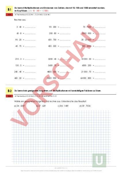 Du kannst Multiplikationen und Divisionen von Zahlen, die mit 10, 100 und 1000 erweitert wurden, im Kopf lösen. (z.B. 40 300 12 000) B1 5.5 à Themenbuch S.52 Nr.1 S.54 Nr.8 S.56 Nr.1 Rechne aus. B2 3 40 90 300 70 7000 60 8 200 80 5000 900 90 20 600 700 30 20 000 40 70 400 500 500 4000 210 3 3200 40 18 000 30 150 5 5600 70 6000 200 240 40 4800 600 21 000 70 450 50 3600 900 64 000 800 Du kennst ein geeignetes Vorgehen, um Multiplikationen mit zweistelligen Faktoren zu lösen. 5.5 à Themenbuch S.52 Nr.2-3 S.53 Arbeitsheft rot S.12 Wähle ein geeignetes Vorgehen und rechne aus. Unterstreiche das Resultat! a) 34 3287 ) 6 2 0 8 6 . . . . . b) 27 629 c) 86 1409 d) 59 7036 MATHE FOX 5.5 Diese Dokumente wurden nicht in Kooperation mit dem Lehrmittelverlag Zürich erstellt und unterliegen allein der inhaltlichen Verantwortung vom MATHE LZK GmbH