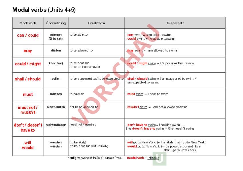 Modal verbs (Units 45) Modalverb Übersetzung can could können fähig sein may dürfen could might könnte(n) shall should sollen must müssen must not mustnt nicht dürfen dont doesnt have to nicht müssen will would werden würden Ersatzform Beispielsatz to be able to can swim. I am able to swim. could swim. I was able to swim. to be allowed to may swim. I am allowed to swim. to be possible to be perhaps/maybe could might swim. Its possible that swim. to be supposed to to be expected to shall should swim. I am supposed to swim. I am expected to swim. to have to must swim. I have to swim. not to be allowed to mustnt swim. I am not allowed to swim. need not neednt dont have to swim I neednt swim. She doesnt have to swim. She neednt swim. (to be likely) (to be possible but unlikely) will go to New York. ( It is likely that go to New York.) would go to New York. ( Its possible but not likely that go to New York.) häufig verwendet in Zeitf. ausser Pres. modal verb infinitive