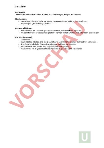 Lernziele Mathematik Die Welt der rationalen Zahlen, Kapitel 1c: Gleichungen, Folgen und Wurzel Gleichungen: Terme vereinfachen: Variablen korrekt zusammenfassen und Klammern auflösen Gleichungen (mit Brüchen) auflösen Muster und Folgen: Muster fortsetzen: Zahlenfolgen analysieren und weitere Glieder ergänzen Vorschriften finden: Gesetzmässigkeiten erkennen und als Wertetabelle oder Term beschreiben Wurzeln (Potenzen): Quadrieren Wurzelziehen (Radizieren): Die Quadratwurzel als Umkehroperation zu Quadrieren anwenden Die Grundregeln beim Wurzelziehen kennen und korrekt anwenden Wurzeln ohne Taschenrechner möglichst weit vereinfachen Wurzeln von Nicht-Quadratzahlen zwischen zwei ganzen Zahlen einordnen