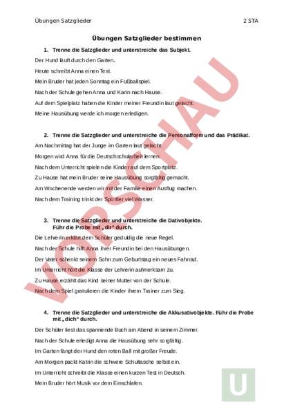 Übungen Satzglieder 2 STA Übungen Satzglieder bestimmen 1. Trenne die Satzglieder und unterstreiche das Subjekt. Der Hund läuft durch den Garten. Heute schreibt Anna einen Test. Mein Bruder hat jeden Sonntag ein Fußballspiel. Nach der Schule gehen Anna und Karin nach Hause. Auf dem Spielplatz haben die Kinder meiner Freundin laut gelacht. Meine Hausübung werde ich morgen erledigen. 2. Trenne die Satzglieder und unterstreiche die Personalform und das Prädikat. Am Nachmittag hat der Junge im Garten laut gelacht. Morgen wird Anna für die Deutschschularbeit lernen. Nach dem Unterricht spielen die Kinder auf dem Sportplatz. Zu Hause hat mein Bruder seine Hausübung sorgfältig gemacht. Am Wochenende werden wir mit der Familie einen Ausflug machen. Nach dem Training trinkt der Sportler viel Wasser. 3. Trenne die Satzglieder und unterstreiche die Dativobjekte. Führ die Probe mit „dir durch. Die Lehrerin erklärt dem Schüler geduldig die neue Regel. Nach der Schule hilft Anna ihrer Freundin bei den Hausübungen. Der Vater schenkt seinem Sohn zum Geburtstag ein neues Fahrrad. Im Unterricht hört die Klasse der Lehrerin aufmerksam zu. Zu Hause erzählt das Kind seiner Mutter von der Schule. Nach dem Spiel gratulieren die Kinder ihrem Trainer zum Sieg. 4. Trenne die Satzglieder und unterstreiche die Akkusativobjekte. Führ die Probe mit „dich durch. Der Schüler liest das spannende Buch am Abend in seinem Zimmer. Nach der Schule erledigt Anna die Hausübung sehr sorgfältig. Im Garten fängt der Hund den roten Ball mit großer Freude. Am Morgen packt Katrin die schwere Schultasche selbst ein. Im Unterricht schreibt die Klasse einen kurzen Test in Deutsch. Mein Bruder hört Musik vor dem Einschlafen. Übungen Satzglieder 5. Trenne die Satzglieder und unterstreiche die Ortsergänzungen. Die Kinder spielen auf dem großen Spielplatz hinter der Schule. Nach dem Unterricht gehen Anna und ihre Freunde nach Hause. Im Sommer reisen wir nach Kroatien ans Meer. Der Hund läuft aus dem Garten auf die Straße. Am Nachmittag treffen sich die Kinder im Park zum Spielen. Der Zug fährt heute von Linz nach Wien. 6. Trenne die Satzglieder und unterstreiche die Zeitergänzungen. Am frühen Morgen beginnt der Unterricht in der Schule. Die Klasse schreibt nach der Pause einen kurzen Test. Im Sommer besucht die Familie in den Ferien die Großeltern. Der Schüler erledigt seine Hausübungen am Abend. Wir haben letzte Woche gemeinsam ein Projekt abgeschlossen. Das Kind lernt seit einem Jahr Klavier in der Musikschule. 7. Trenne die Satzglieder und unterstreiche die Artergänzungen. Ruhig und konzentriert arbeitet die Klasse an den Aufgaben. Der Hund läuft fröhlich über die Wiese. Im Unterricht erklärt die Lehrerin sehr geduldig die neue Regel. Das Mädchen öffnet das schwere Paket vorsichtig. Die Schüler hören der Lehrerin aufmerksam zu. Der Sportler trainiert mit großer Ausdauer für den Wettkampf. 8. Trenne die Satzglieder und unterstreiche die Begründungsergänzungen. Wegen des starken Regens fällt der Ausflug heute aus. Der Schüler fehlt wegen einer Erkältung im Unterricht. Aus Neugier ist die Klasse heute besonders aufmerksam. Das Kind weint aus Angst vor dem lauten Donner. Wir bleiben aus Vorsicht lieber zu Hause. Die Kinder jubeln vor Freude über den Sieg. 2 STA