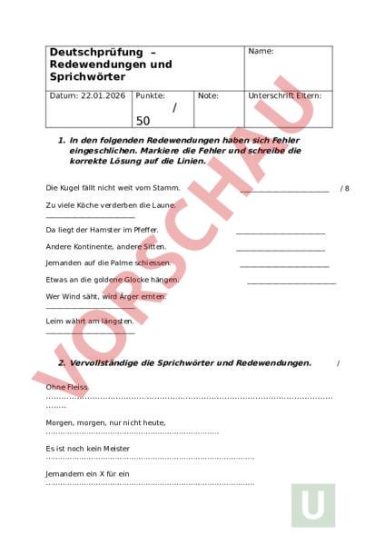 Deutschprüfung – Redewendungen und Sprichwörter Datum: 22.01.2026 Punkte: Name: Note: Unterschrift Eltern: 50 1. In den folgenden Redewendungen haben sich Fehler eingeschlichen. Markiere die Fehler und schreibe die korrekte Lösung auf die Linien. Die Kugel fällt nicht weit vom Stamm. /8 Zu viele Köche verderben die Laune. Da liegt der Hamster im Pfeffer. Andere Kontinente, andere Sitten. Jemanden auf die Palme schiessen. Etwas an die goldene Glocke hängen. Wer Wind säht, wird Ärger ernten. Leim währt am längsten. 2. Vervollständige die Sprichwörter und Redewendungen. 10 Ohne Fleiss Morgen, morgen, nur nicht heute, . Es ist noch kein Meister . Jemandem ein für ein . Die Spreu vom Eine Schwalbe Gebrannte Kinder Was Hänschen nicht lernt, Wer sagt, Die Axt im Haus . 3. Erkläre, was die Sprichwörter bedeuten. /7 Fix und fertig sein Jemanden aufs Glatteis führen Jemandem die Stirn bieten Jemandem den Laufpass geben Ein Kapitel für sich sein Ein Mekka für einen Briefmarkensammler sein Farbe bekennen 4. Ergänze die Redewendungen und Sprichwörter. /8 Es ist gang und diese Feste zu feiern. Meine Schwester folgt mir auf und Tritt. Du rechnest auf deine eigene Art und. Seine Erzählungen waren und erlogen. Er musste Kopf und riskieren, damit er helfen konnte. Es wird auf und brechen nicht funktionieren. Sein Argument ist gut, es hat Hand und Die Familie zieht mit Kind und in eine neue Stadt. 5. Um welche Sprichwörter handelt es sich hier? /5 6. Welche Erklärung trifft zu? Kreuze die richtige Aussage an. Haare auf den Zähnen haben Hartnäckig sein Sehr böse sein Jemanden gut täuschen können Einen Bock schiessen Etwas grossartiges finden Einen Fehler machen Sehr viel Glück haben Wie Kraut und Rüben sein Sich gut verstehen Sich häufig streiten Ein Durcheinander sein In der Kreide sein Verzweifelt sein Schulden haben Schuldgefühle haben Das Kriegsbeil begraben In einem Streit verwickelt sein Sich zum ersten Mal bewähren Frieden schliessen 7. Schreibe eine Redewendung oder ein Sprichwort auf und erläutere die Herkunft. Sprichwort/Redewendung: Herkunft: /5 /1 8. Markiere alle Redewendungen und Sprichwörter die du im Text findest. 2.5 Gestern habe ich meine beste Freundin getroffen. Sie hat mir erzählt, dass sie sich Hals über Kopf verliebt habe. Ich war sehr überrascht. Wir haben uns einige Stunden unterhalten und ich habe ihr auch von meinem abwechslungsreichen Leben erzählt. Die Abende verbringe ich meistens mit Lernen, denn Übung macht den Meister. Gelernt ist gelernt, deshalb nehme ich mir diese Zeit äusserst gerne. Manchmal verzweifle ich ein wenig, doch kommt Zeit kommt Rat. Heute früh bin ich wie ein Strauss zum Bus gerannt. Dabei habe ich eine schwarze Gestalt gesehen. Ich zitterte wie Espenlaub und bin nur noch gerannt. Mein Gefühl: