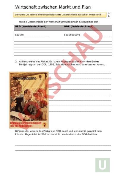 Wirtschaft zwischen Markt und Plan Lernziel: Du kennst die wirtschaftlichen Unterschiede zwischen West- und Ostdeutschland. 1. Li ste die Unterschiede der Wirtschaftsentwicklung in Stichworten auf: BRD (Westdeutschland) DDR (Ostdeutschland) Soziale Sozialistische 2. A) Beschreibe das Plakat. Es ist ein Propagandaplakat für den Ersten Fünfjahresplan der DDR, 1952. Schreibe nur hin, was du erkennen kannst. B) Vermute, warum das Plakat zur DDR passt und was damit gemeint sein könnte. Abgebildet ist Walter Umbricht, ein bedeutender DDR-Politiker.